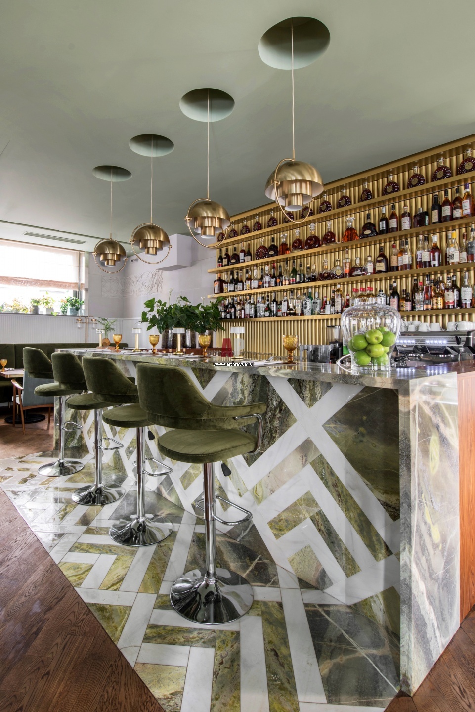 Барная стойка зашита камнем двух цветов с активным геометрическим орнаментом. Бар выполнен из дерева: вертикальные рейки выкрашены в бронзово-горчичный цвет.