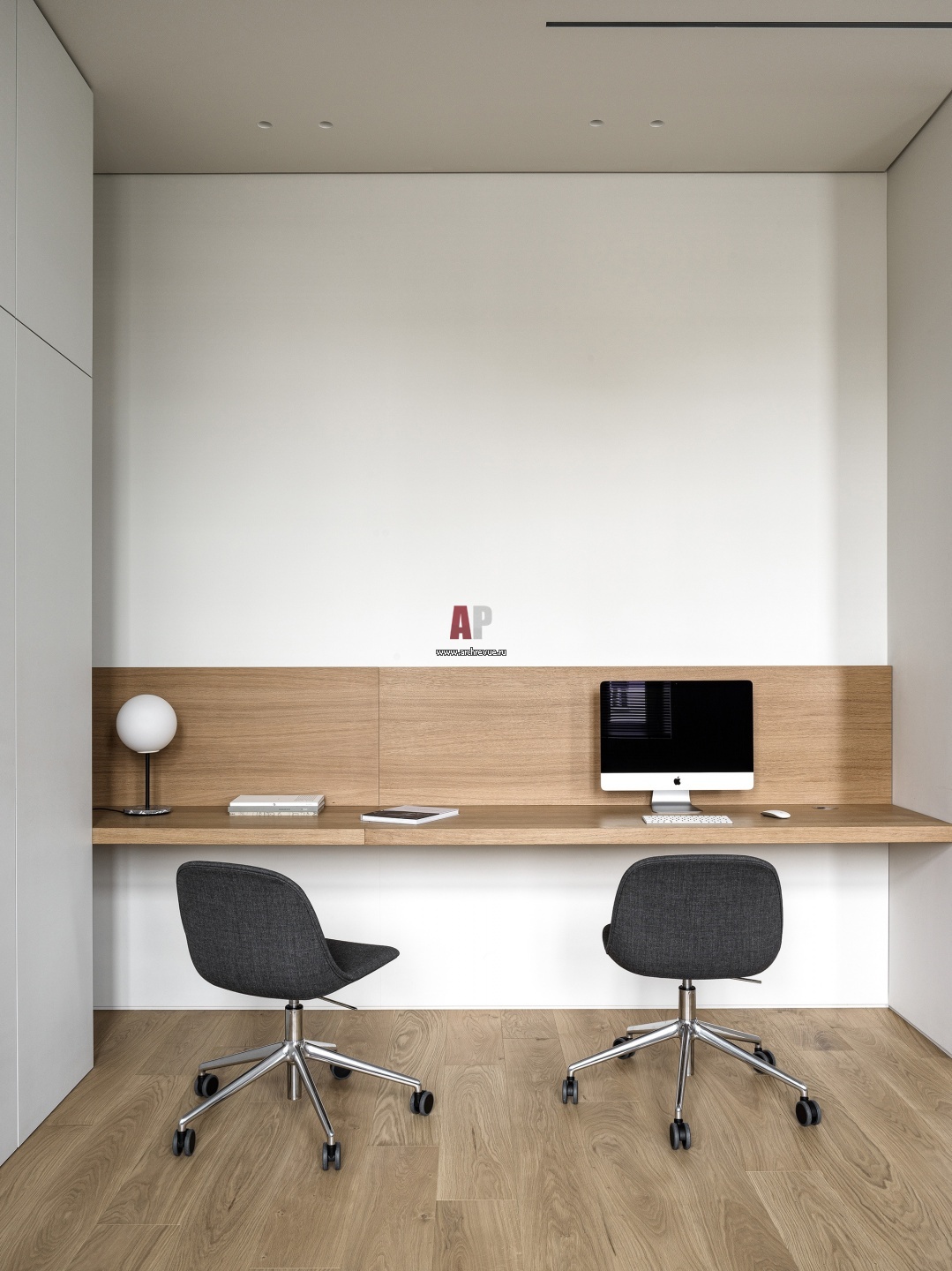 Рабочая зона в детской. Стол и шкафы, на заказ. Стулья, Muuto. Настольная лампа, Audo Copenhagen.