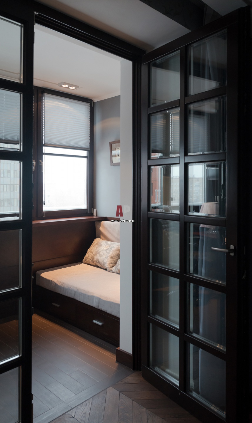 На лоджии, которая примыкает к спальне, расположена зона отдыха с кабинетом. Стеклянные перегородки с черными переплетами.