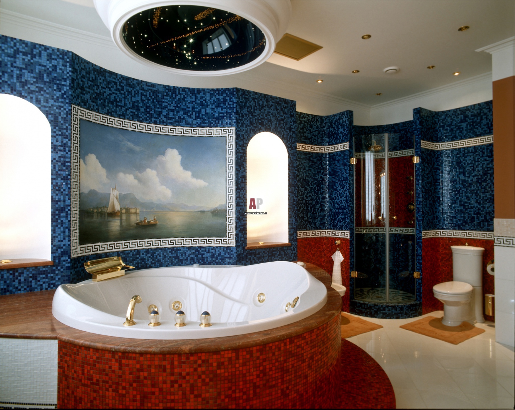Хозяйская ванна с элементами античного стиля. Мозаика Bisazza, поставщик «Конвент-Центр». Панно – копия работы Айвазовского. На потолке над ванной Hoesch – натяжная конструкция «звездное небо».
