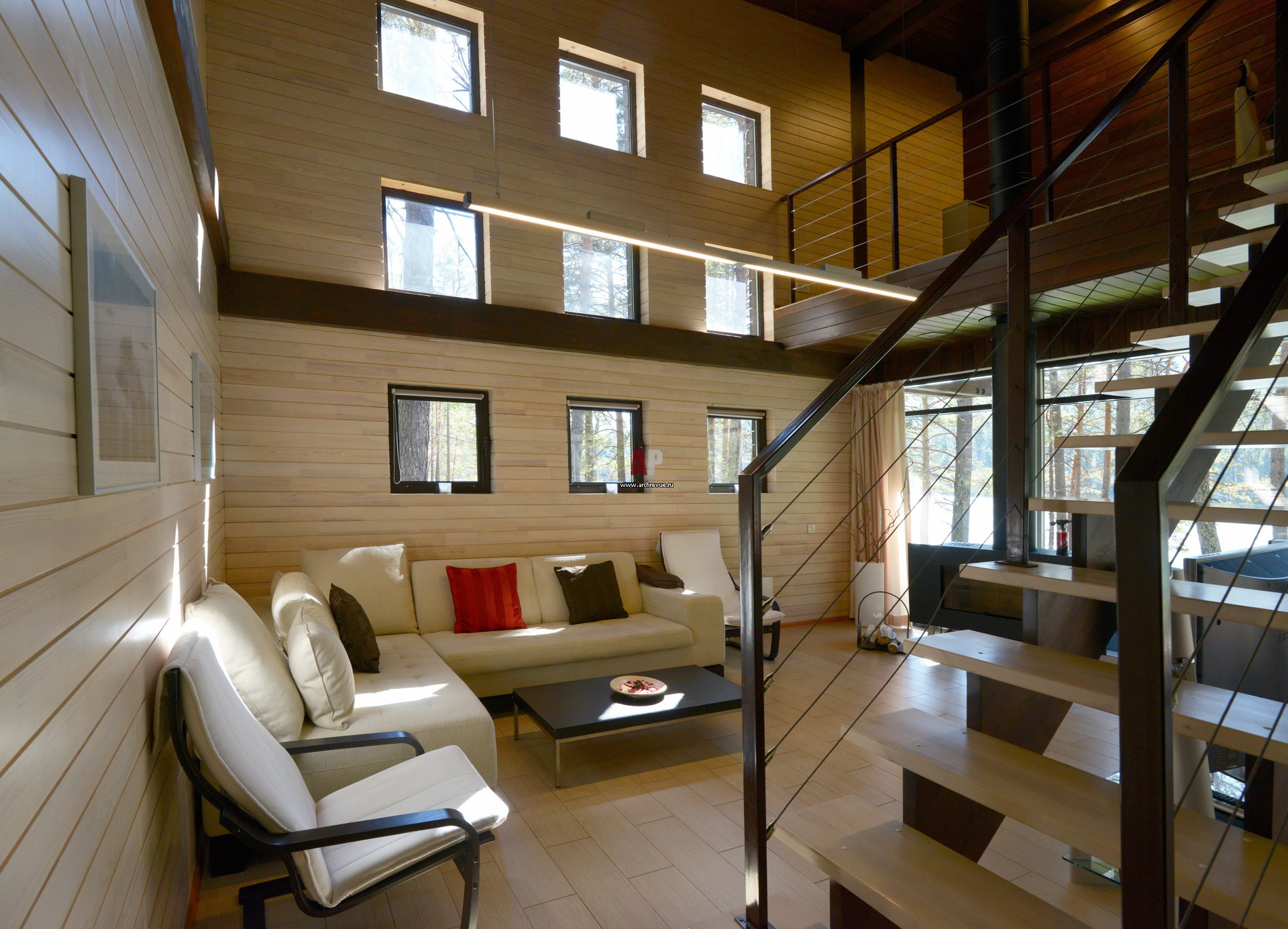 Номер «Люкс» расположен в отдельностоящем двухэтажном коттедже. В интерьере преобладает светлое дерево. Три ряда окон на торцевой стене добавляют освещенности и сообщают интерьеру модернистскую выразительность.