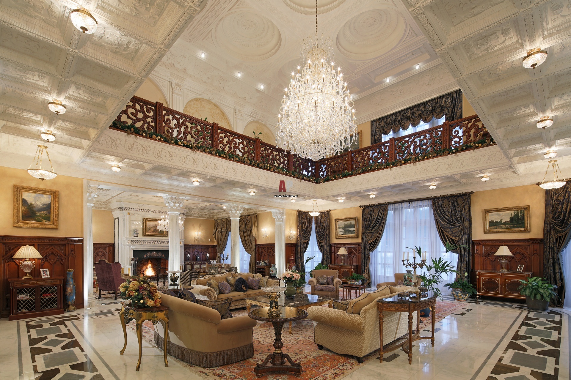 Парадная гостиная выполнена в классическом дворцовом английском стиле. Низ стен зашит панелями из красного дерева, верх оклеен светлыми обоями.