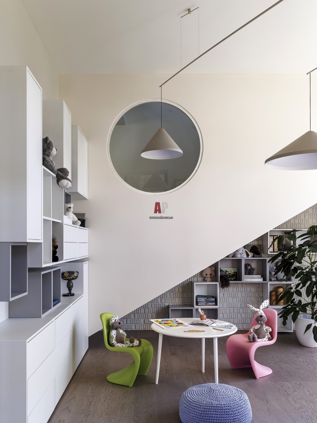Детская игровая с высоким потолком. Массивная конструкция лестницы оформлена окном-иллюминатором в духе архитектуры конструктивизма. Цветные стульчики из пластика, Vitra. Светильники, Vibia.