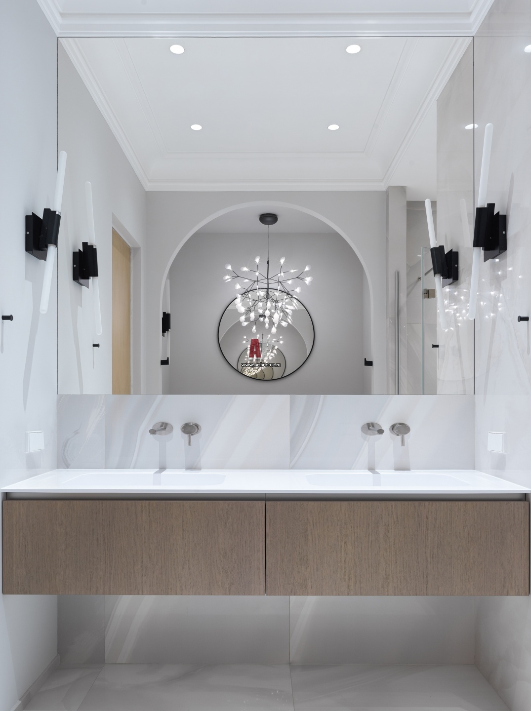 Хозяйский санузел. Керамогранит, Rex. Раковина и подстолье, Milldue. Смесители, Gessi. В панорамном зеркале отражается интересная перспектива.