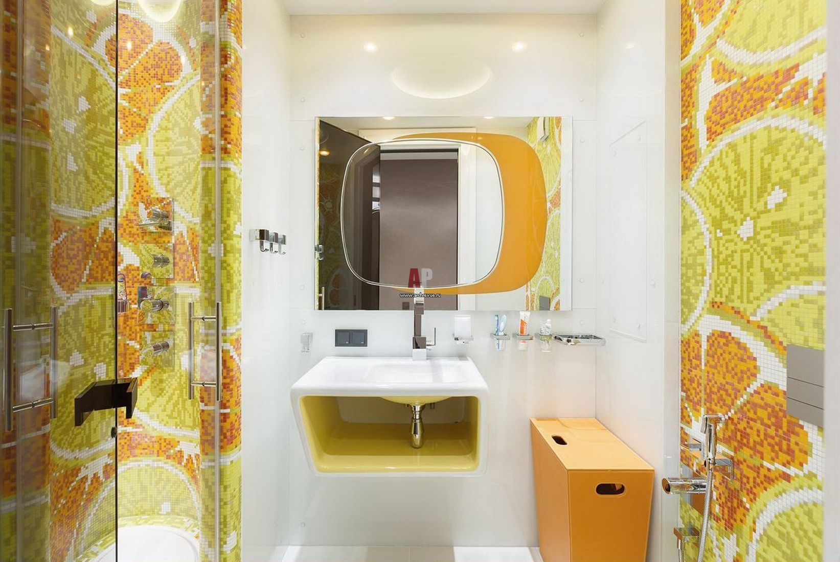 Интерьер детского санузла в жизнерадостных лимонно-апельсиновых тонах. На стенах – мозаика с изображением цитрусовых. Сантехника, Jorger.