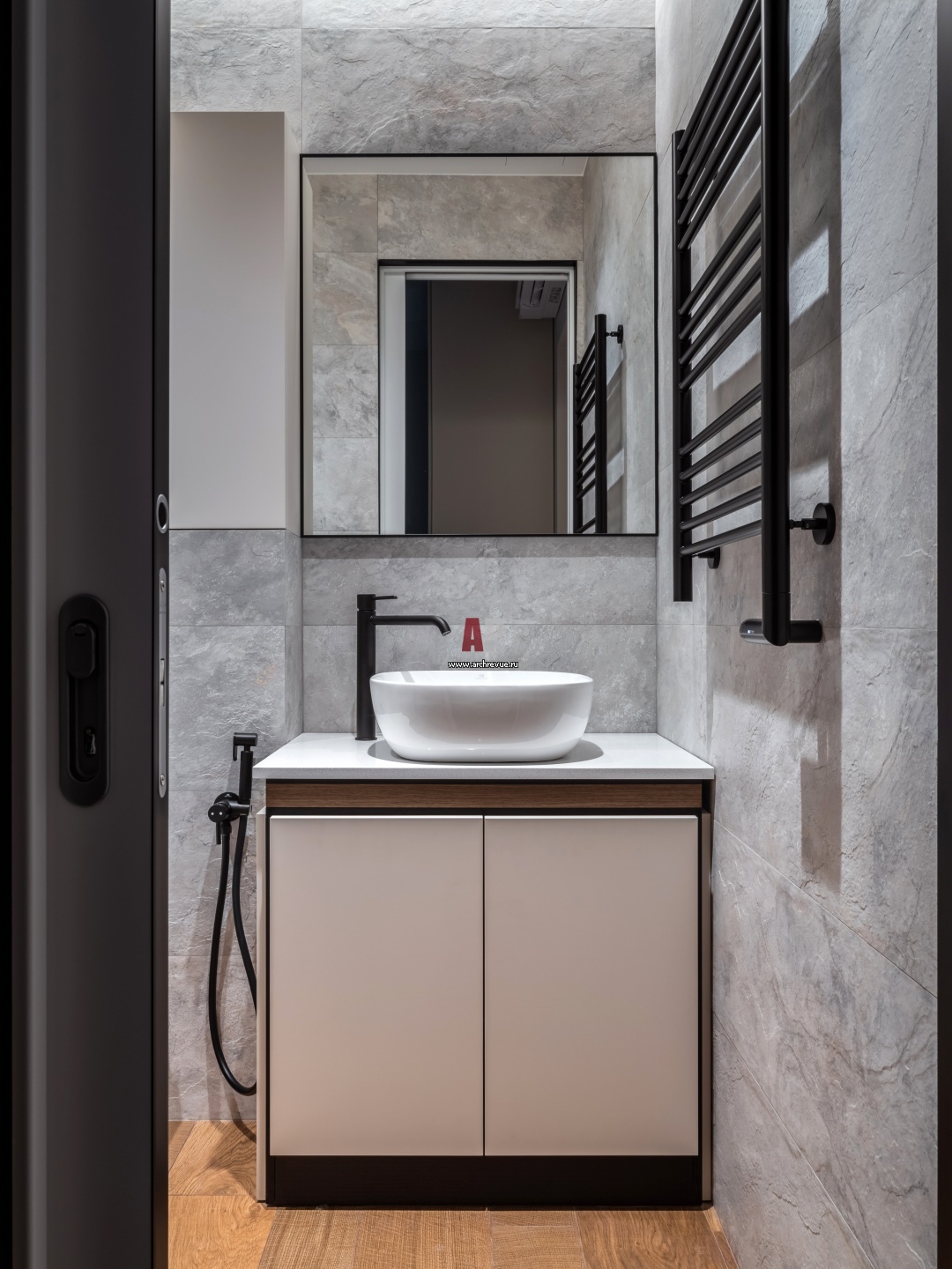 Компактный гостевой санузел. Раковина черные смесители, Noken.
