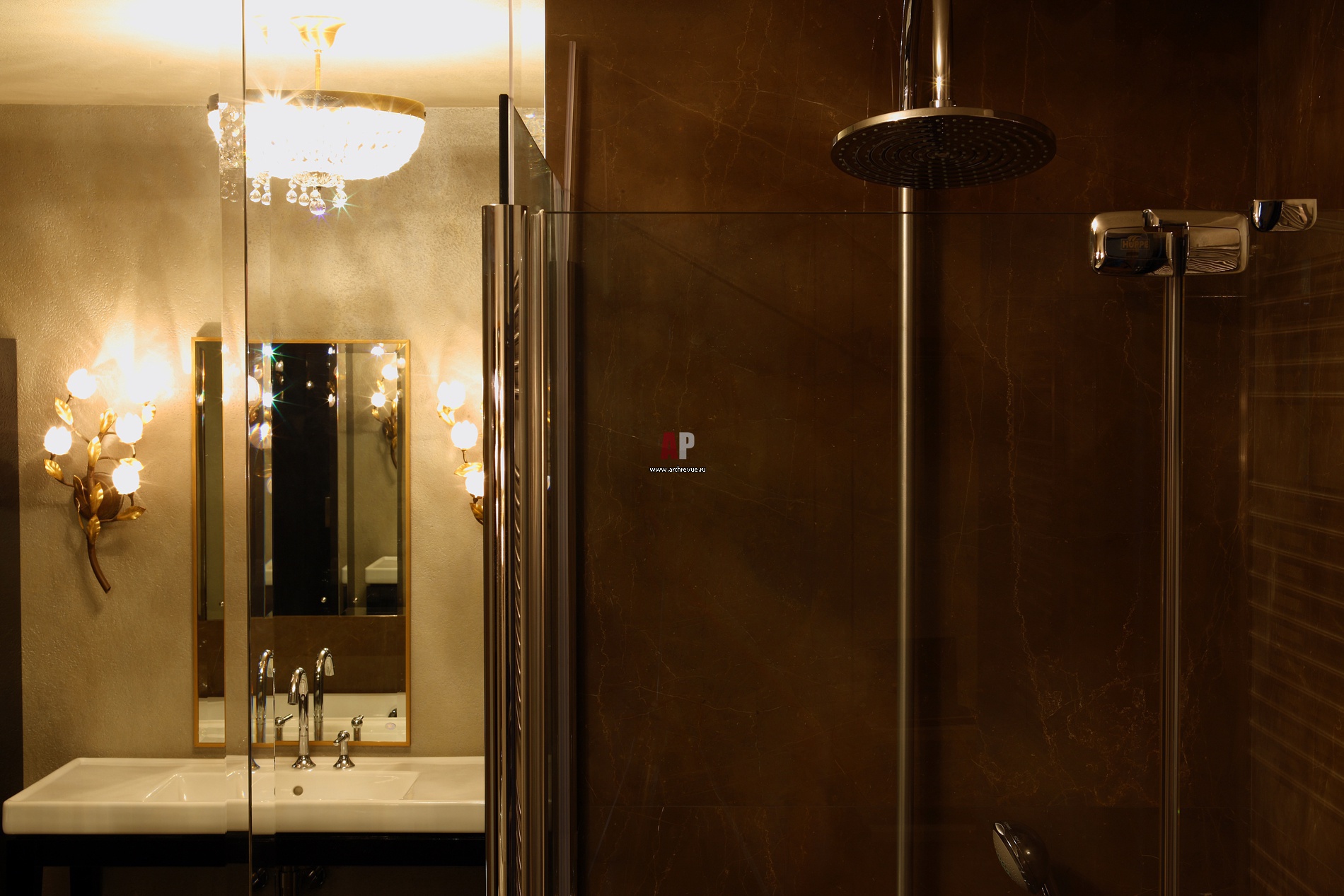Хозяйская ванная с элементами гламура. Стены облицованы мрамором «Бронза Армани». Сантехника, Villeroy & Boch.