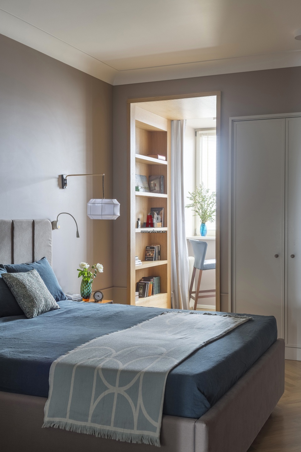 Интерьер спальни родителей. На присоединенной лоджии сделан кабинет с библиотекой. За встроенным шкафом расположилась сложная система вентиляции и кондиционирования всей квартиры.