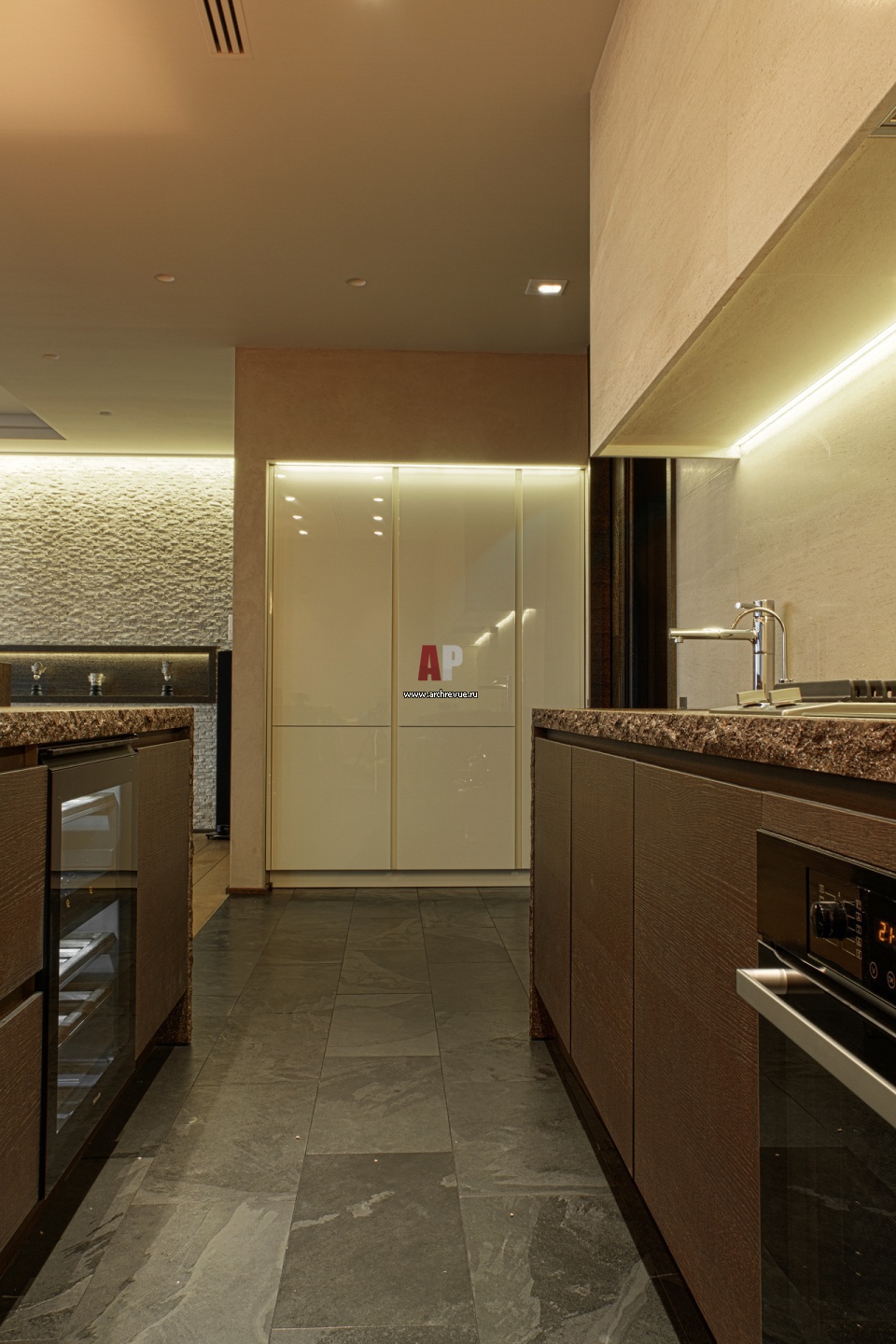 Интерьер кухни выдержан в минимализме. Каменная столешница с рваными краями.