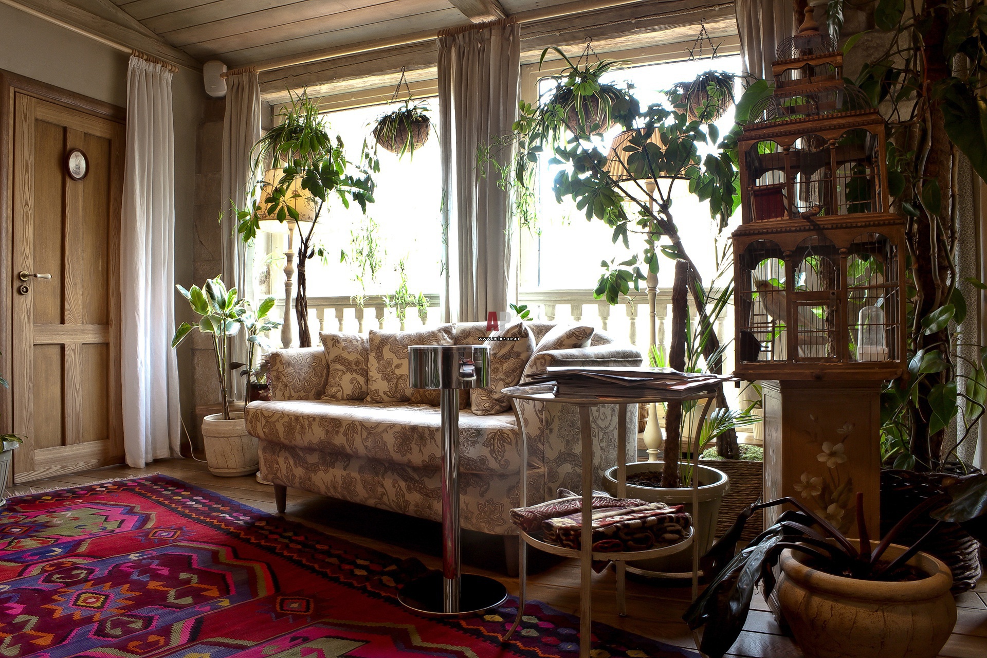 Зона отдыха с видом на открытую террасу. Балюстрада из дерева. Живые растения, грузинские ковры.