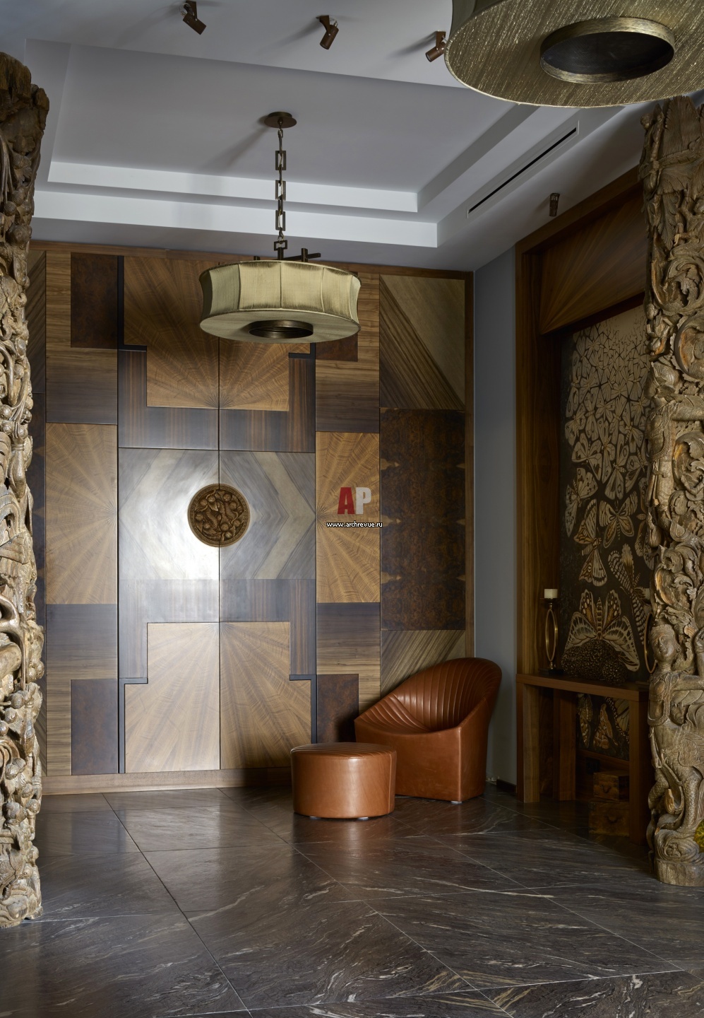 Украшение прихожей – выполненный на заказ шкаф из 12 сортов дерева. С ним перекликаются антикварные восточные колонны из резного тика, привезенные из Азии.