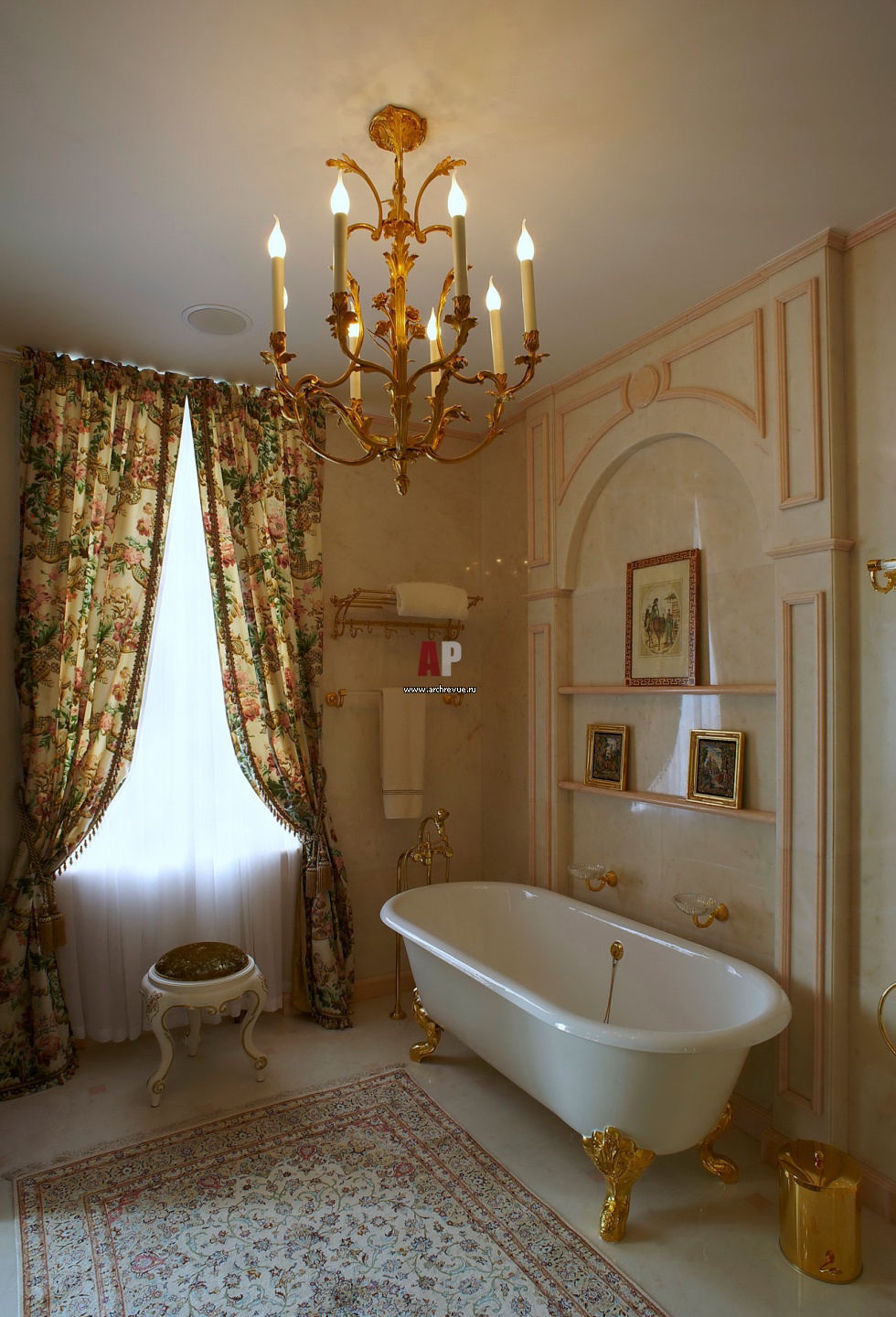 Стены и пол главной ванной комнаты выложены натуральным мрамором цвета слоновой кости и розоватого оттенка (Rosso Bellissimo). Ванна, Herbeau.