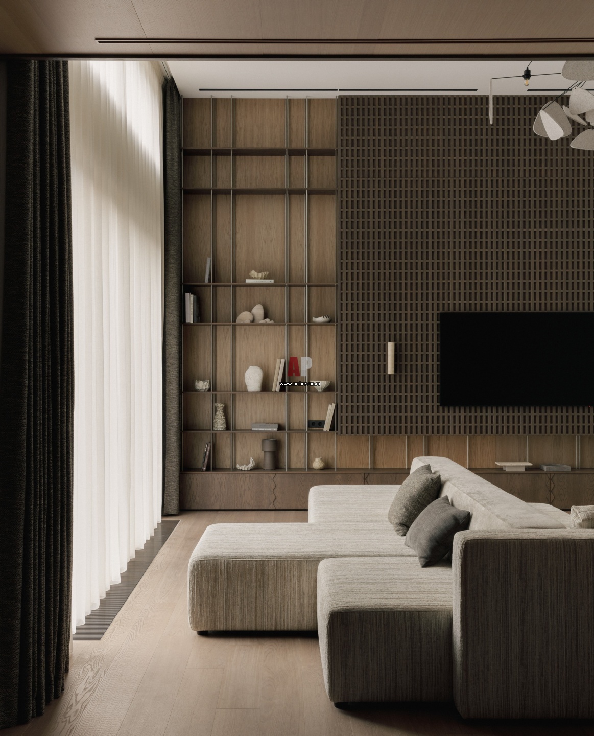 Дом в сосновом лесу. Интерьер мягкой зоны в общей гостиной. Геометрию интерьера подчеркивают натуральные материалы и разнообразные фактуры поверхностей. Акцент сделан на освещении с эффектом преломления света.
