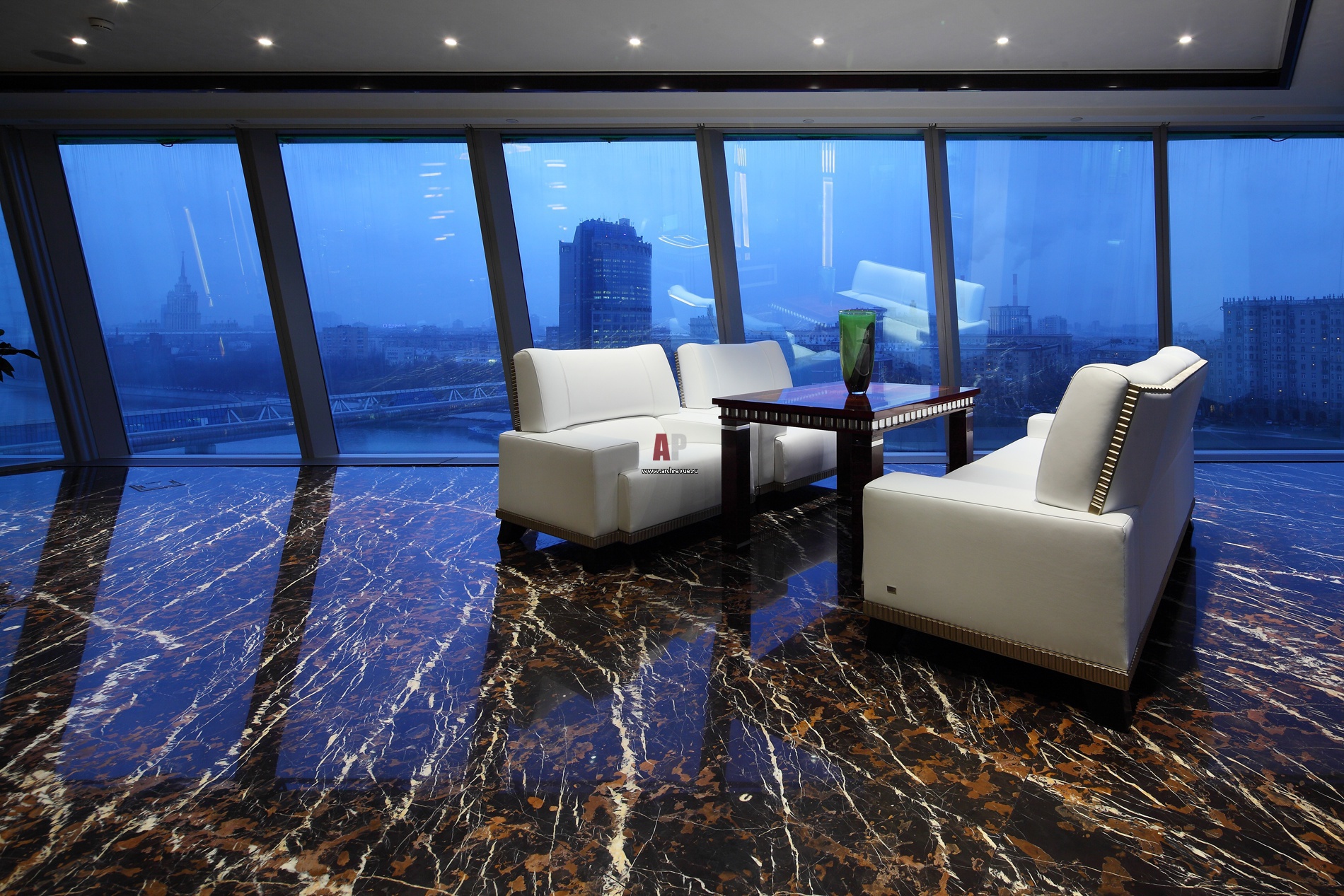 За окном офиса – панорама ночной столицы. Пол выложен слэбам из красного мрамора с белыми прожилками, поставщик «Бенефит».