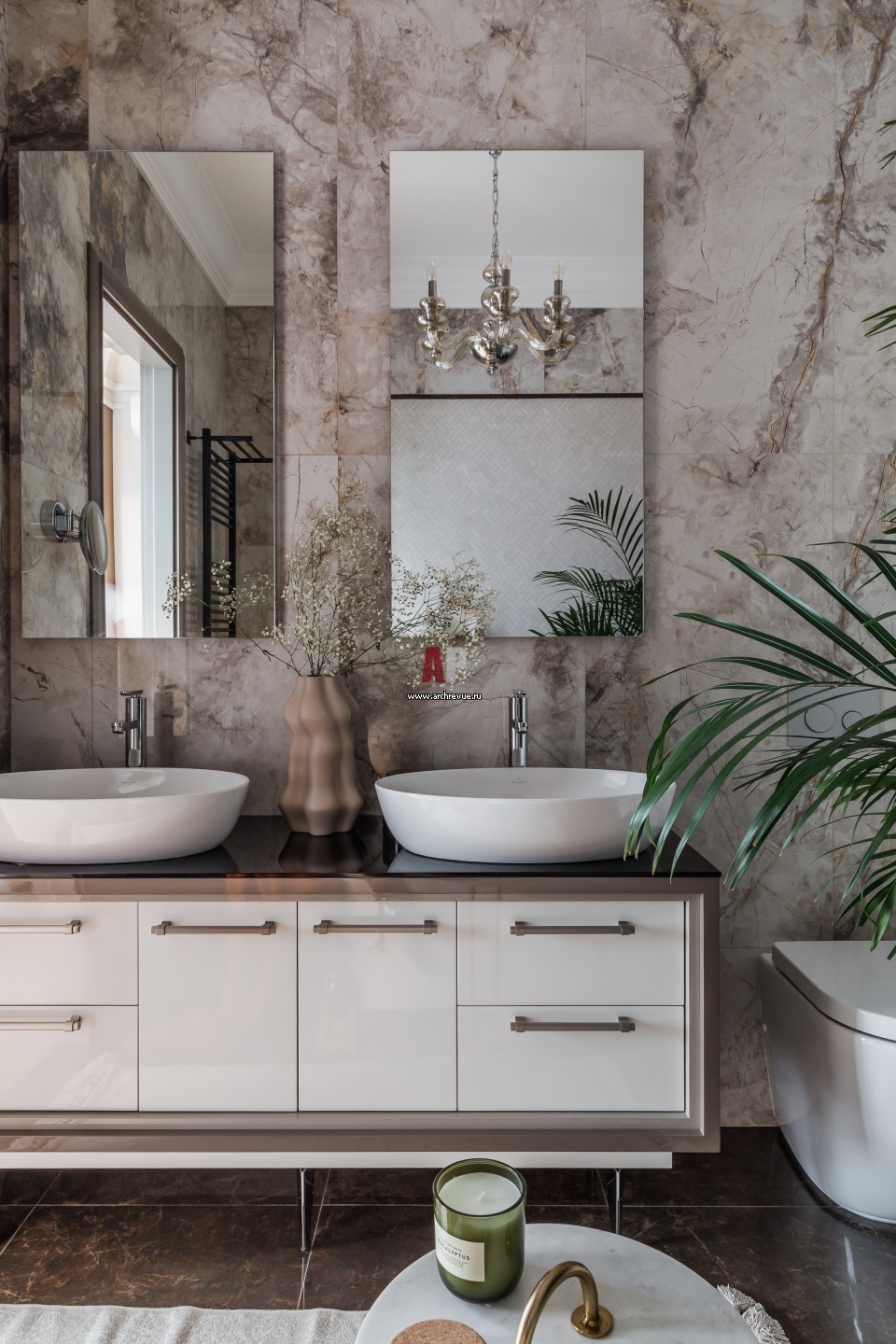 Хозяйская ванная комната. Стены и пол отделаны керамогранитом с фактурой натурального камня. Тумбы изготовлены на заказ. Раковины, Villeroy & Boch. Унитазы, ArtCeram. Инсталляции, Tece.