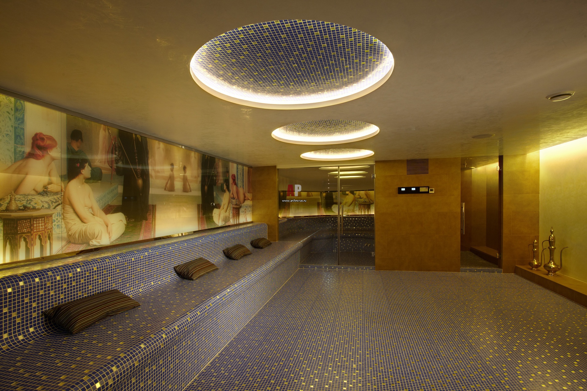 Хаммам расположен в подвальном этаже. Пол и сиденья облицованы мозаикой синего цвета. Стена украшена подсвеченными изнутри стеклянными панелями с репродукциями картин французского художника-неореалиста. За стеклянными перегородками находится парная.