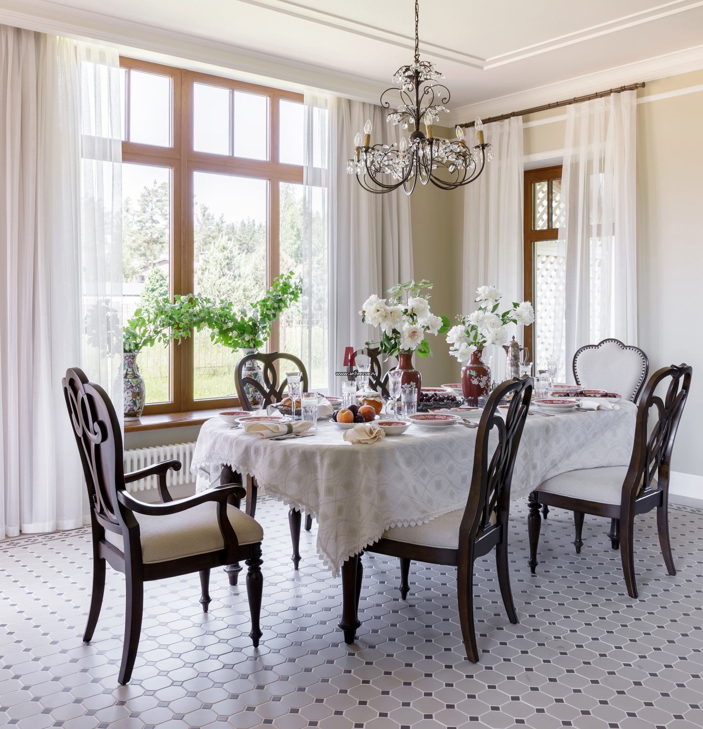 Столовое – самое светлое помещение в доме. На полу – белая керамическая плитка, TopCer. Мебель, винтаж и антиквариат.