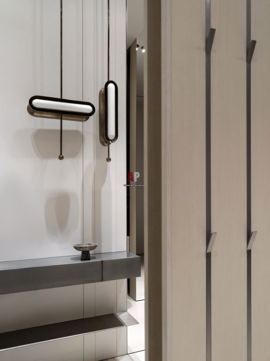 Тактильный минимализм в апартаментах ЖК «Болшевик». Прихожая. Декоративные подвесные светильники, Apparatus, модель Circuit.
