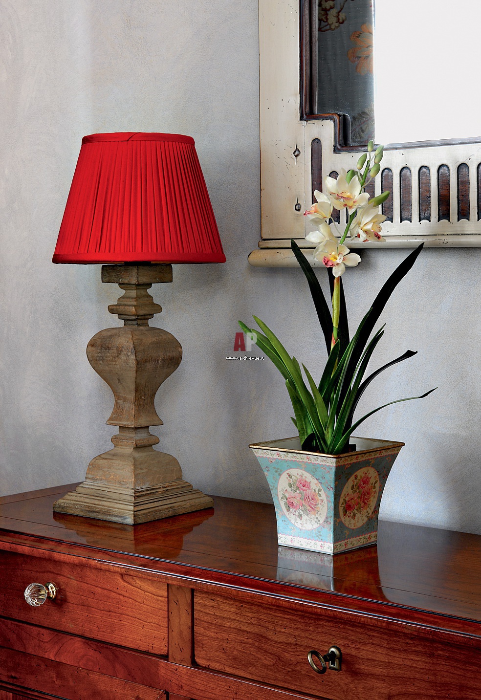 Красные акценты добавляют цвет в почти монохромный интерьер. Настольная лампа с красным абажуром, Mis en Demeure.