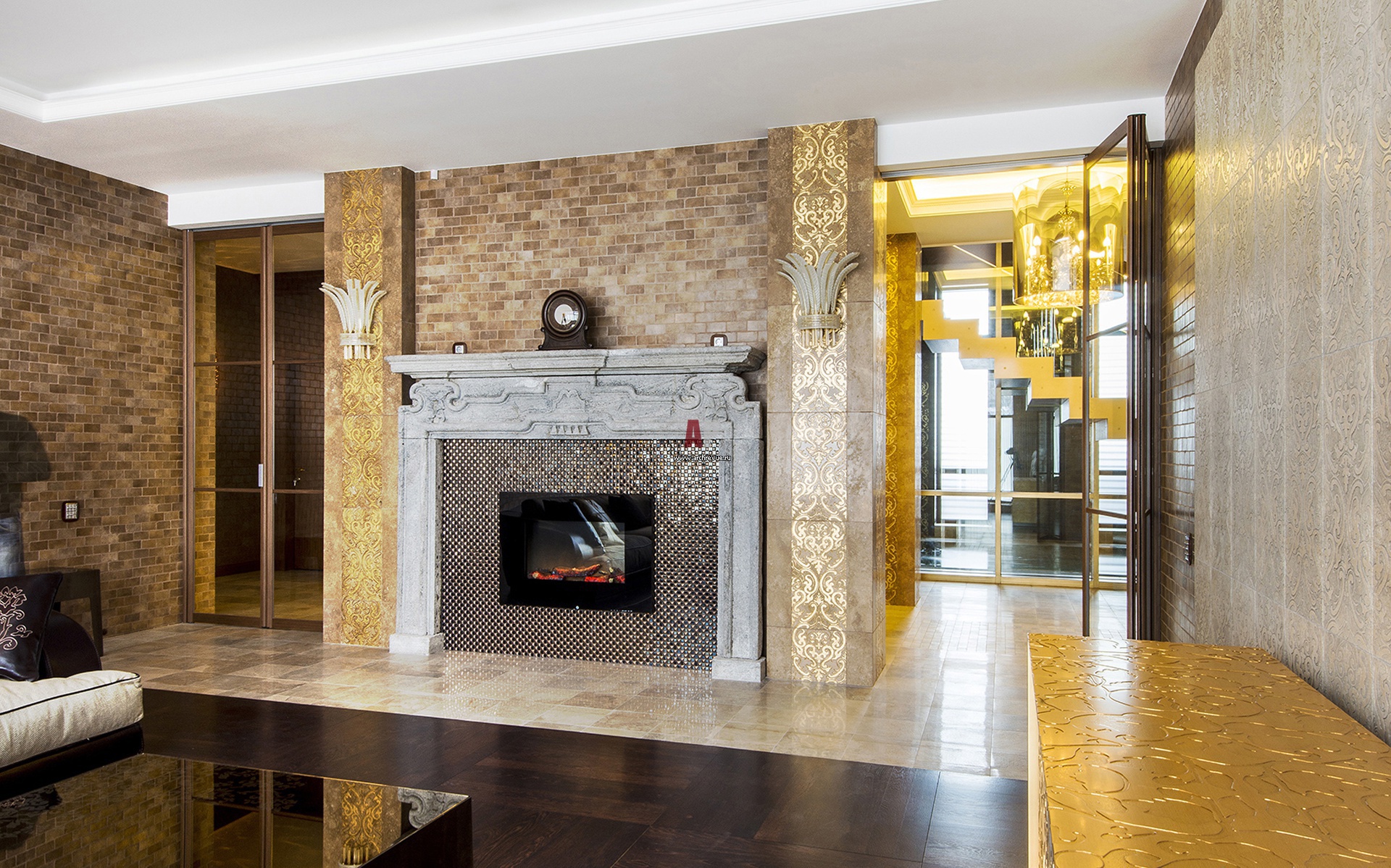 Фото интерьера эклектичной гостиной с камином. Гранитный портал камина антикварный, датирован XVI веком, он привезен из Италии специально для этого дома.
