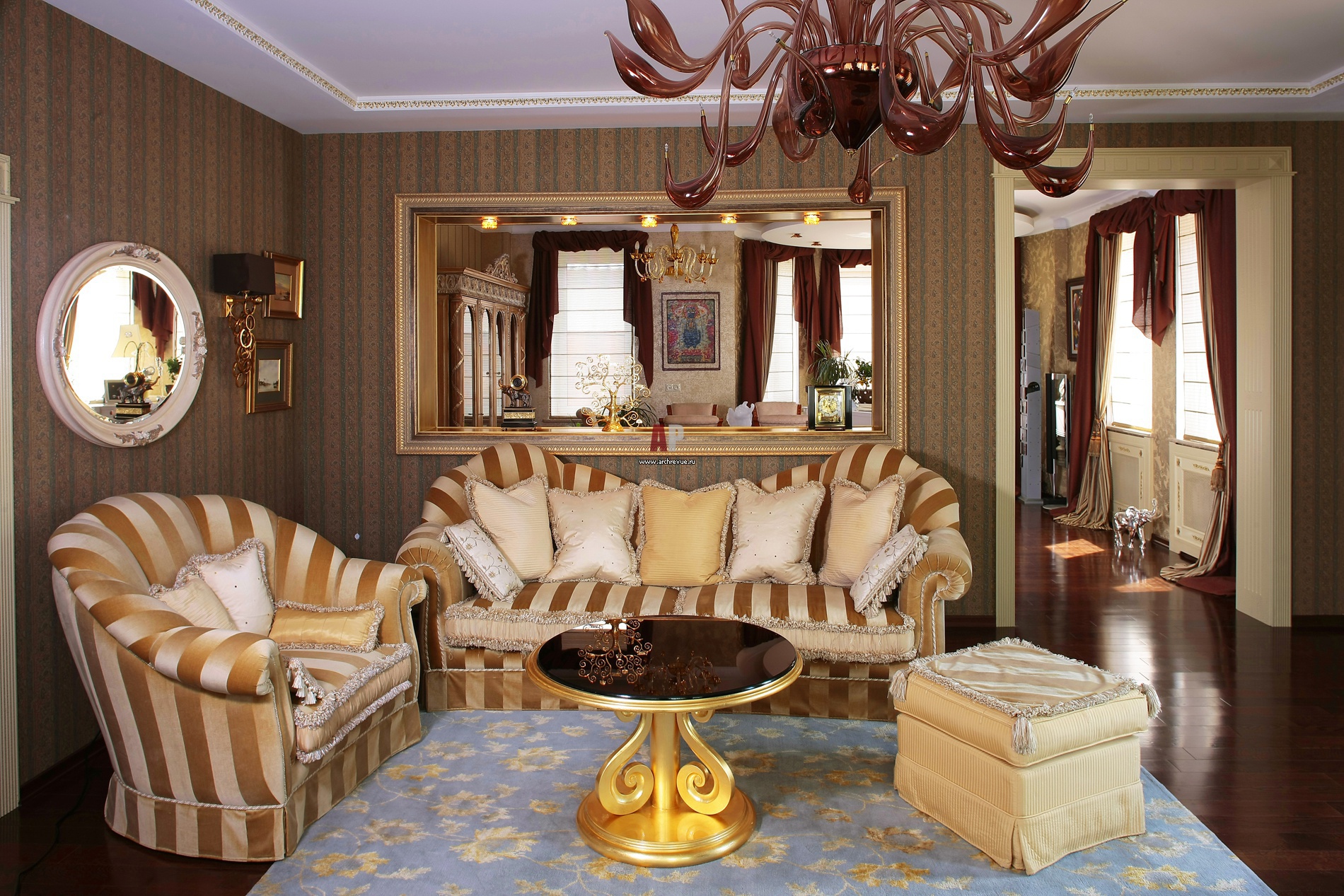 Вид из гостиной на столовую открывается с двух точек: через широкий дверной портал и сквозь вытянутое по горизонтали «окно», обрамленное в золотую раму и декорированное мрамором. Оно больше всего напоминает зеркало, в котором отражается нарядная обстановка.