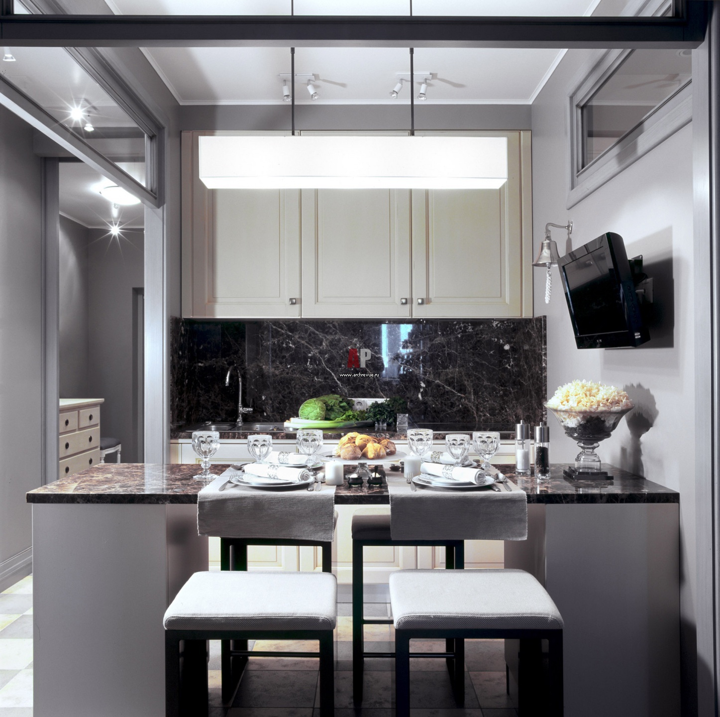 Кухня в серо-серебристых тонах. Столешница барной стойки и кухонный фартук выполнены из слэбов темного мрамора. Барную стойку акцентирует прямоугольный светильник.