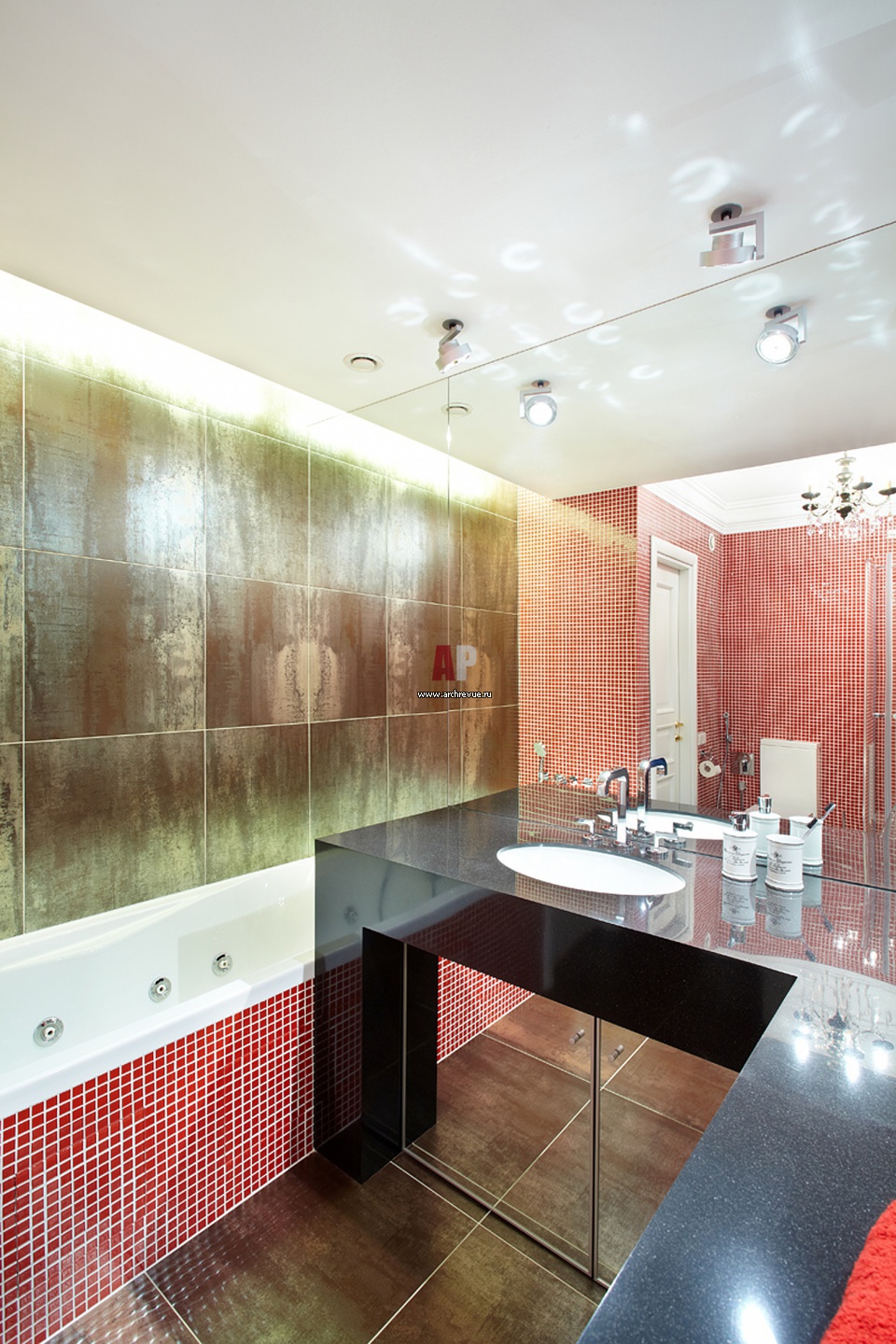 Стена за ванной, а также пол выложены керамогранитом под патинированную бронзу. Ванна, Glass 1989. Стойка умывальника сделана из черного искусственного камня с мерцающими вкраплениями.