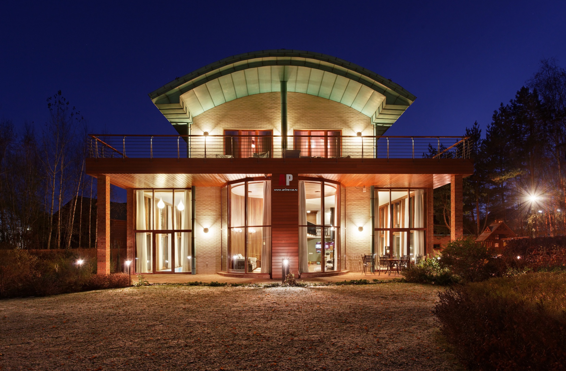 Основная ось композиции дома направлена на заросший соснами склон. Дом как бы вплывает в него. В полукруглом эркере находится гостиная.