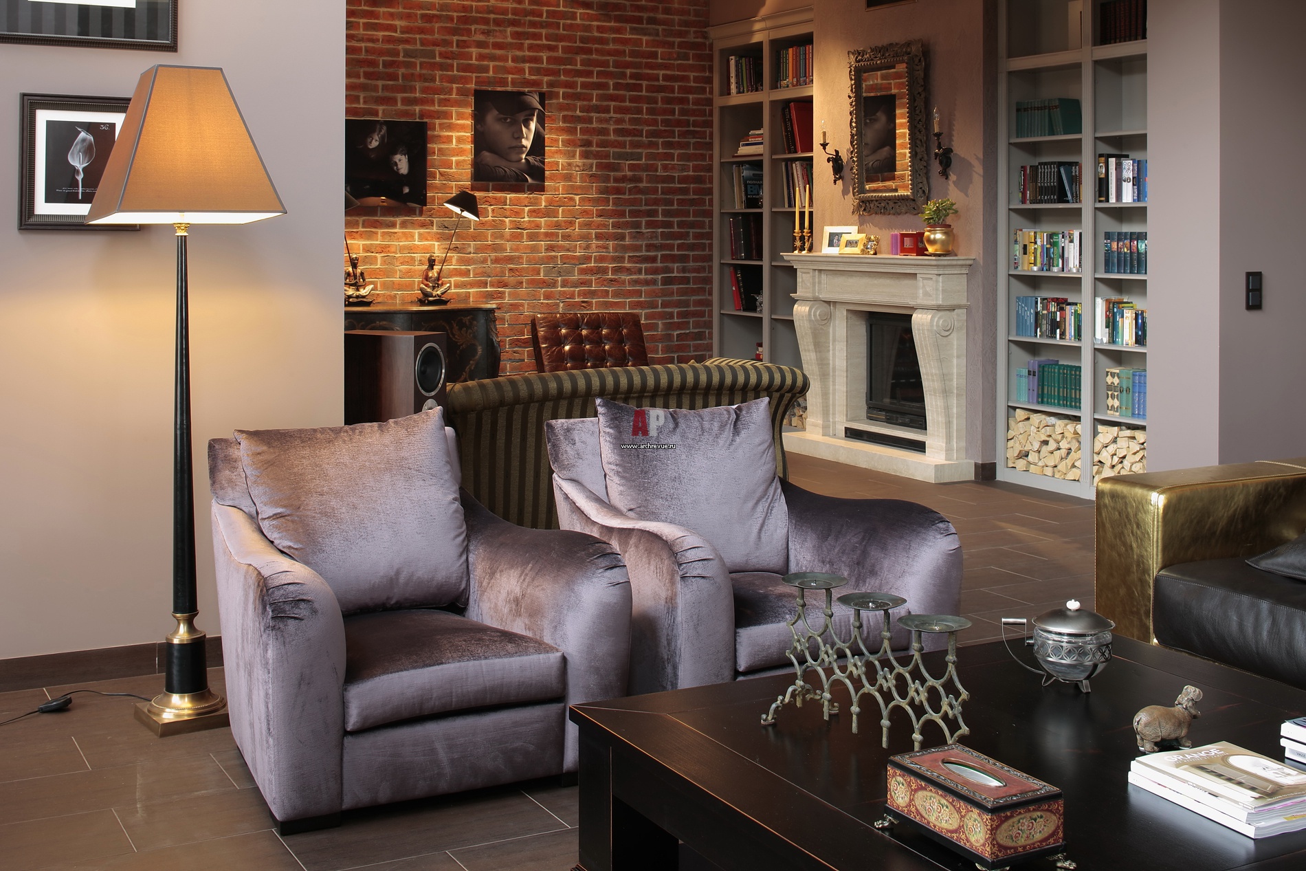 Библиотечные стеллажи обрамляют камин и формируют уютное пространство для чтения и размышлений.