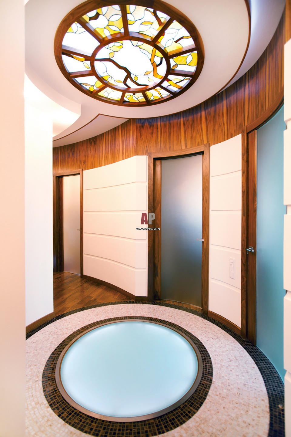 Круговой холл – буфер между общественной и приватной зонами. Потолочный витраж повторяется в оформлении пола.