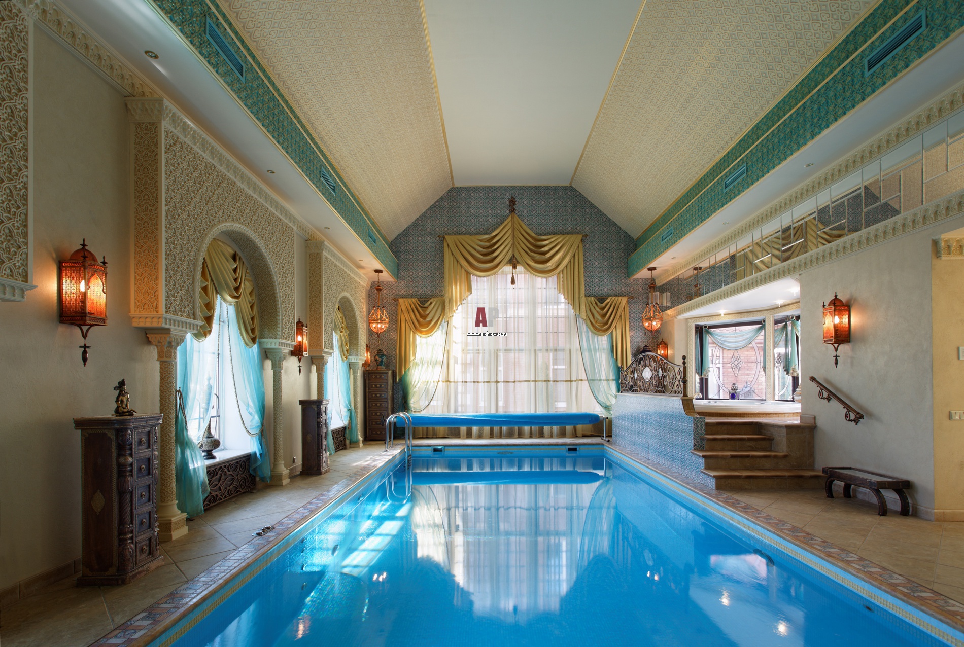 Бассейн оформлен в восточной стилистике. Его украшение – характерная для восточной стилистики гипсовая лепнина, изготовление «Триглиф». Из соображений практичности потолок оформлен росписью, имитирующий лепной узор.