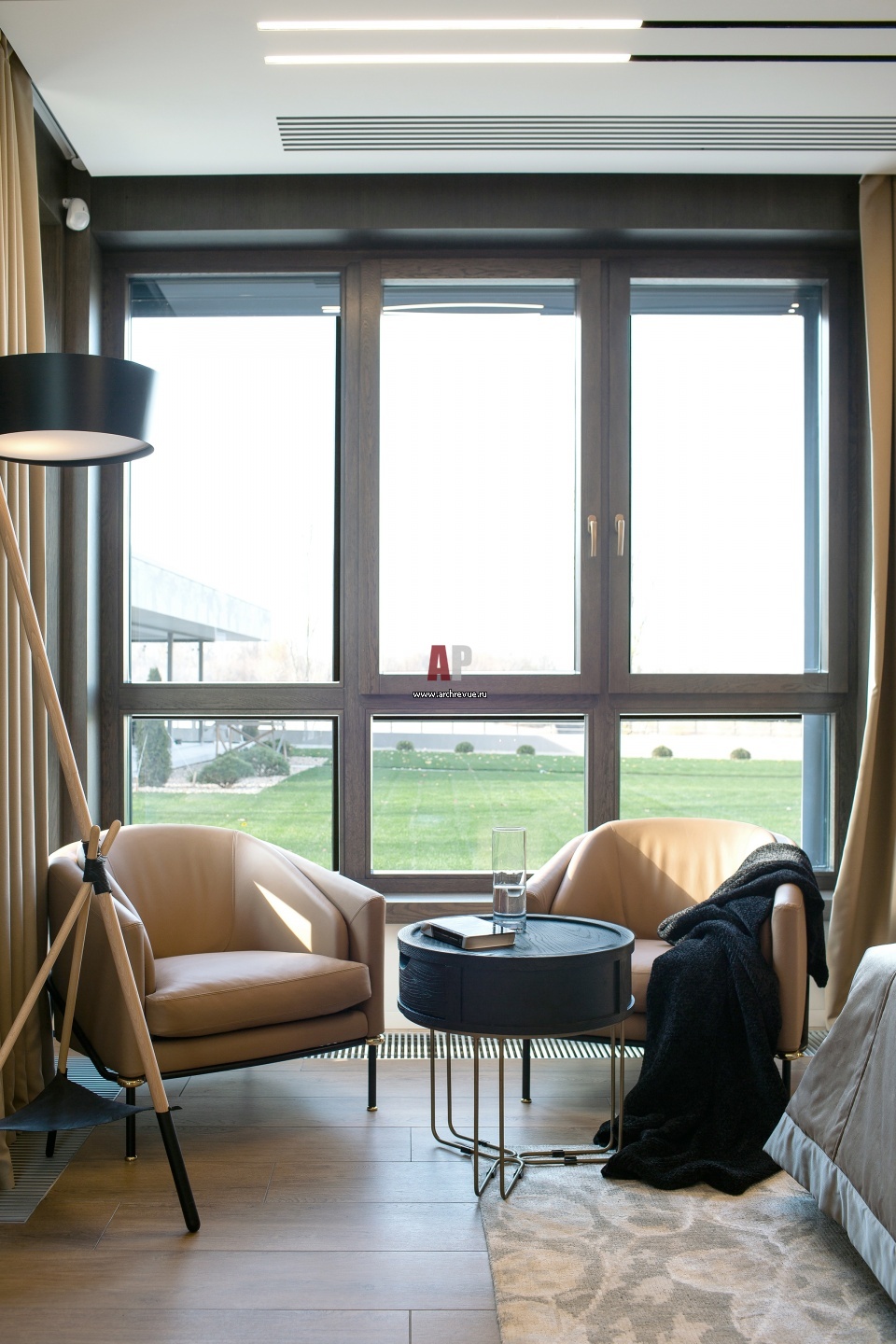 Огромное преимущество дома – панорамные окна, обращенные на берег реки. Они есть почт во всех жилых помещениях. Кресла, Minotti.