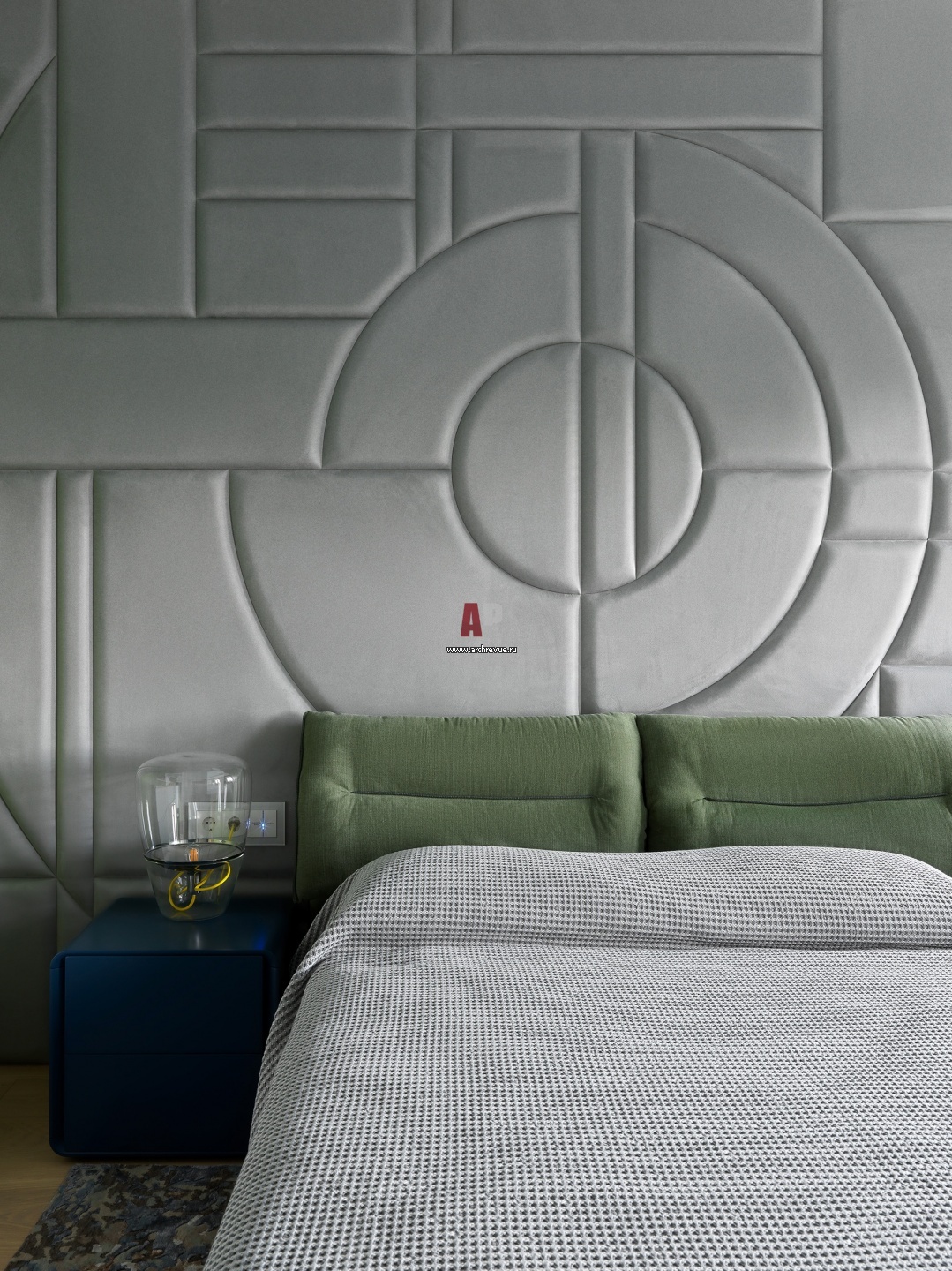 Спальня сына. Стена за изголовьем кровати оформлена геометрическим панно из замшевых панелей, изготовленными по эскизам авторов проекта.