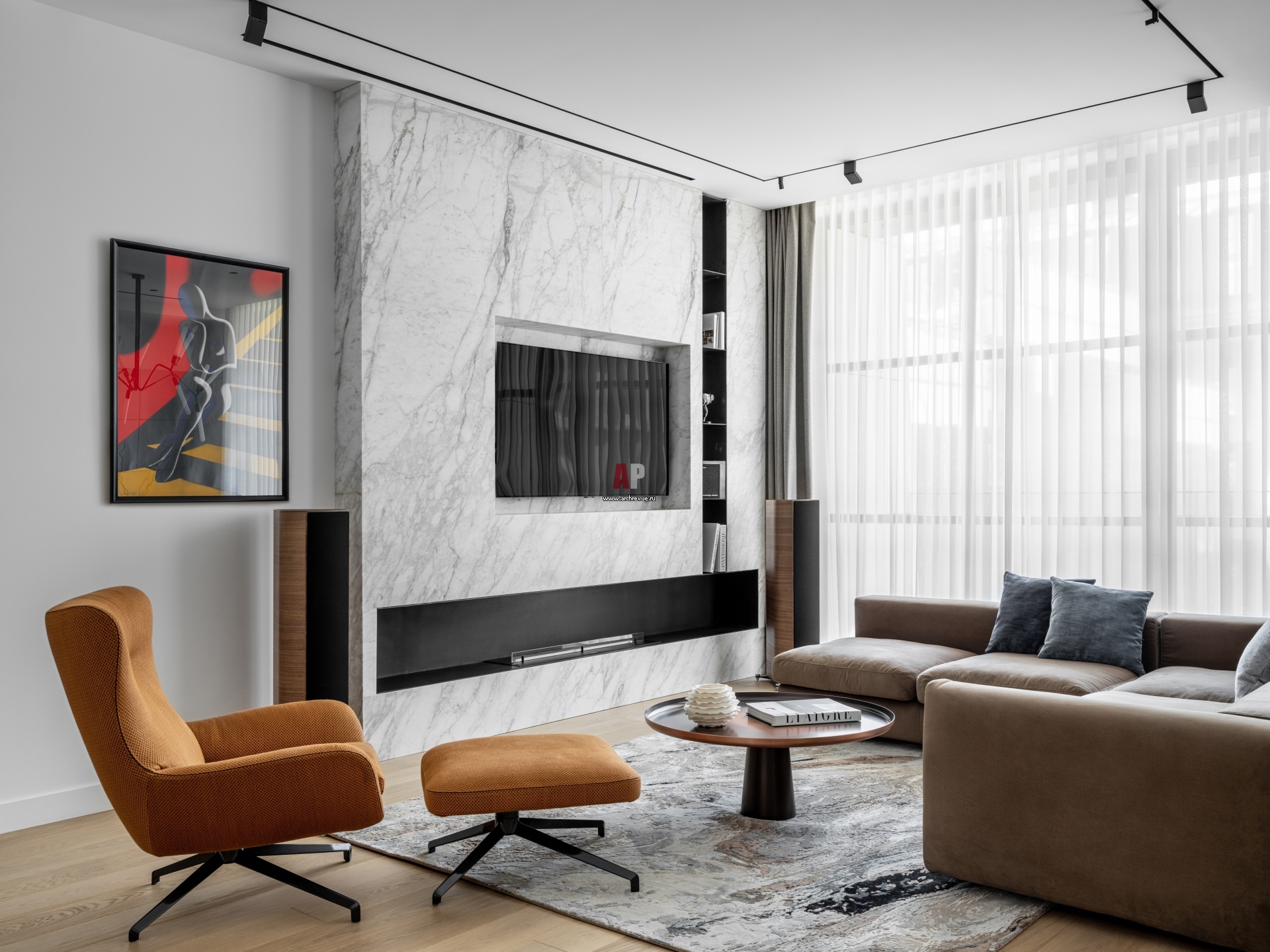 Доминанта гостиной – каменное панно из светлого мрамора, который привезли под заказ из Италии, оно сделано из трех слэбов. Каменная стена объединяет домашний кинотеатр с музыкальной с hi-end аппаратурой и биокамин.