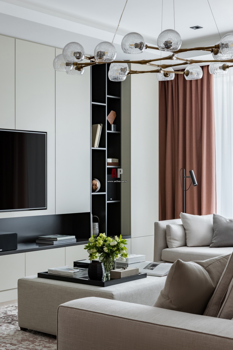 Светлая квартира в высотке. Стеллаж со скрытыми модулями для хранения оборудования домашнего кинотеатра сделан на заказ. Графичная композиция подчеркивает современную архитектуру комплекса. Потолочный светильник, Arteriors. Торшер, Rubn.