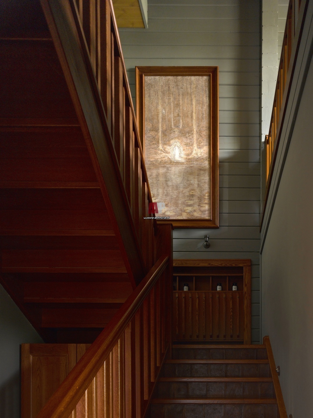 Лестница на второй этаж выполнена из древесины ясеня красивого красного оттенка. Подступенки облицованы плиткой котто. На стене – созданное Натальей Юниной панно, вдохновленное графикой Йона Бауэра на тему скандинавского фольклора.