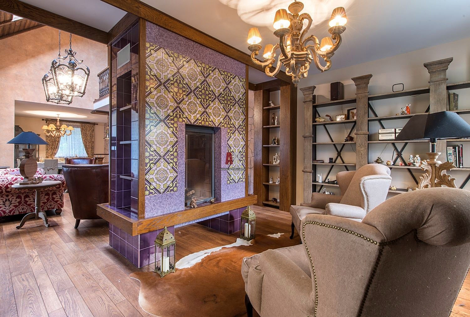 Двусторонний камин с французской чугунной двухсторонней топкой облицован керамикой ручной работы Francesco De Maio с ярким традиционным орнаментом. Пол и окантовка камина – дуб, тонированный под орех.