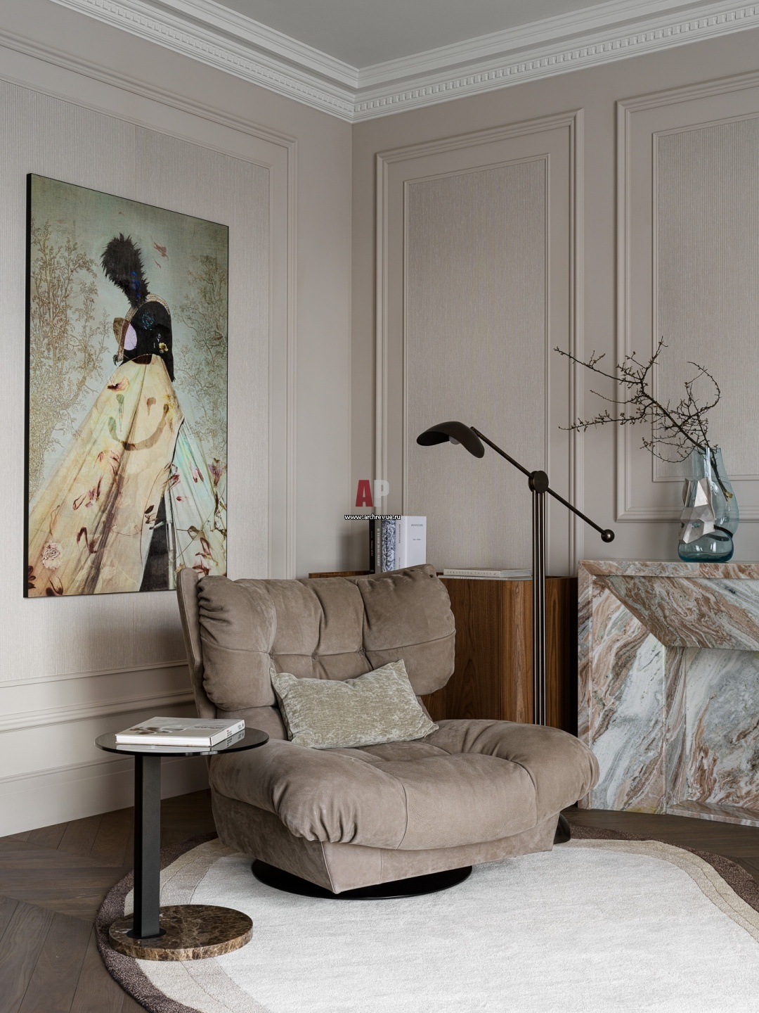 Зона отдыха в спальне. Кресло, Baxter. Столик, BoConcept. Тумба, Sovet Italia. Портал фальш-камина из натурального мрамора.