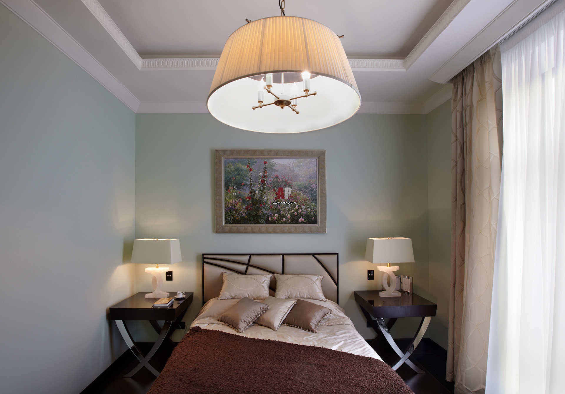 Небольшая гостевая комната. Главный декоративный прием – двухуровневые потолки с лепным декором. Кровать, прикроватные тумбочки в стиле ар-деко.