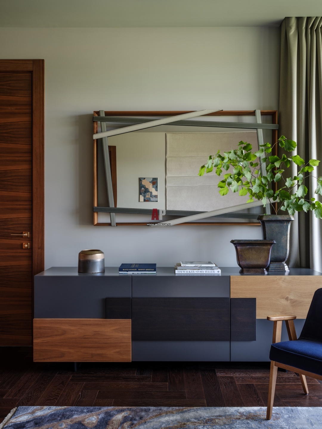 В интерьере спальни присутствуют элементы стиля mid-century modern. Синее кресло, Gubi. Тумба, Crate and Barrel.