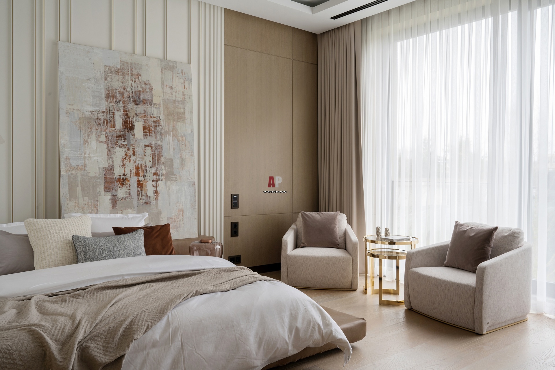 Апартаменты дочери включают спальню, гардеробную комнату и ванную и выполнены в нежной, легкой палитре. Низкая кожаная кровать, Ivano Redaelli. Кресла Signorini & Coco, столики, Fendi. Картина Ольги Шагиной.