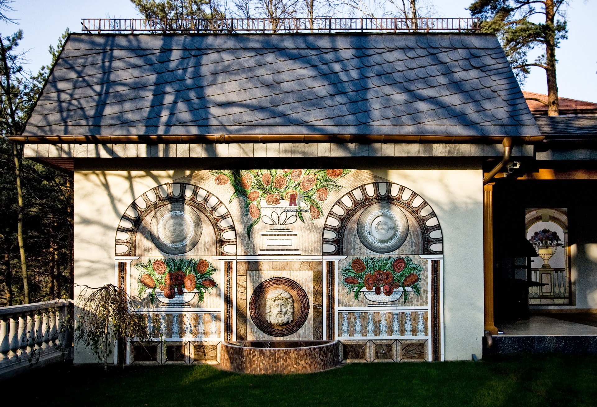 Фонтан оформлен мозаичным панно и каменными скульптурами.