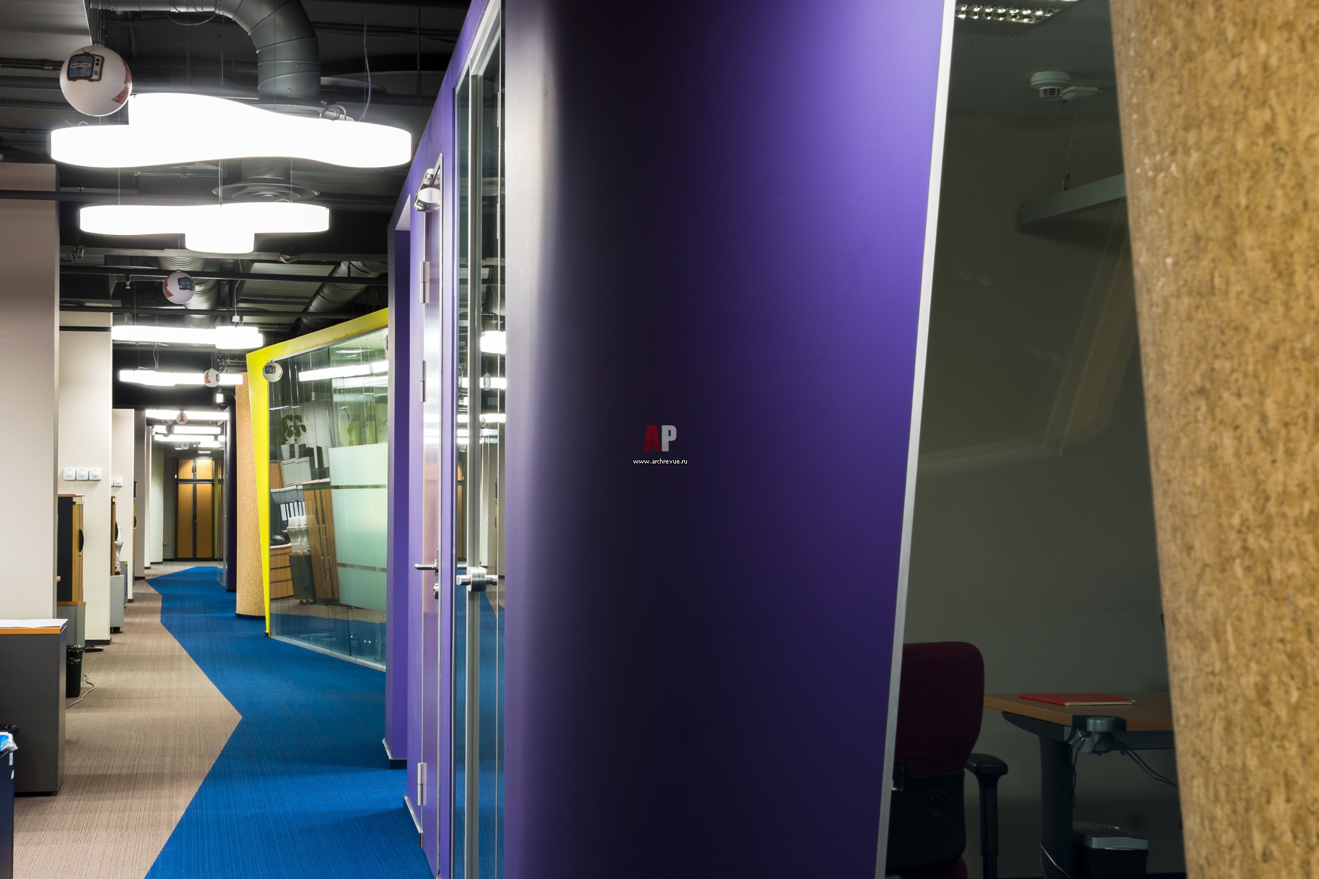 Интерьер рабочей зоны офиса. Наклонные стеклянные перегородки в ряде помещений создают между соседними объемами иллюзию аркады.