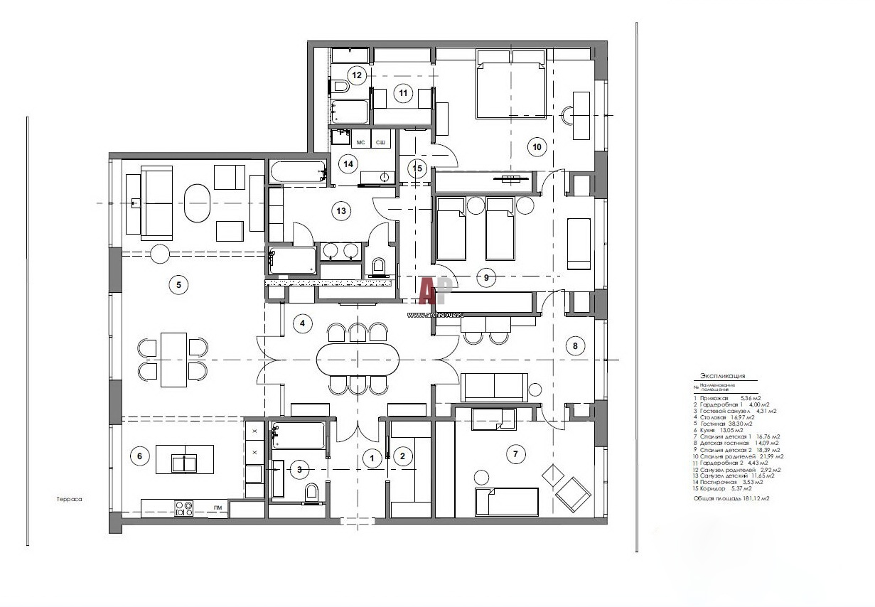 План квартиры с тремя спальни и открытыми террасами. Общая площадь – 180 кв. м.