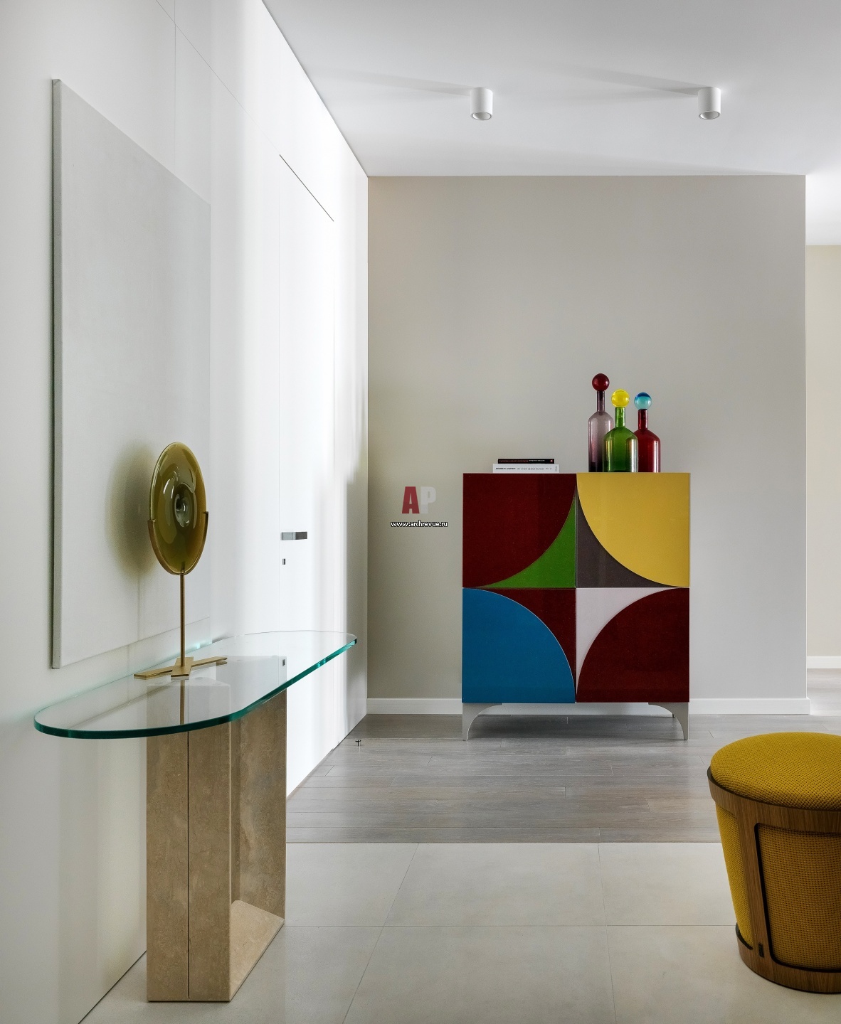 Интерьер прихожей. Стена оформлена МДФ-панелями, за которыми находится просторный шкаф для верхней одежды и дверь-невидимка в спальню дочери. Разноцветный комод, Roche Bobois. На полу керамогранит, Atlas Concorde.
