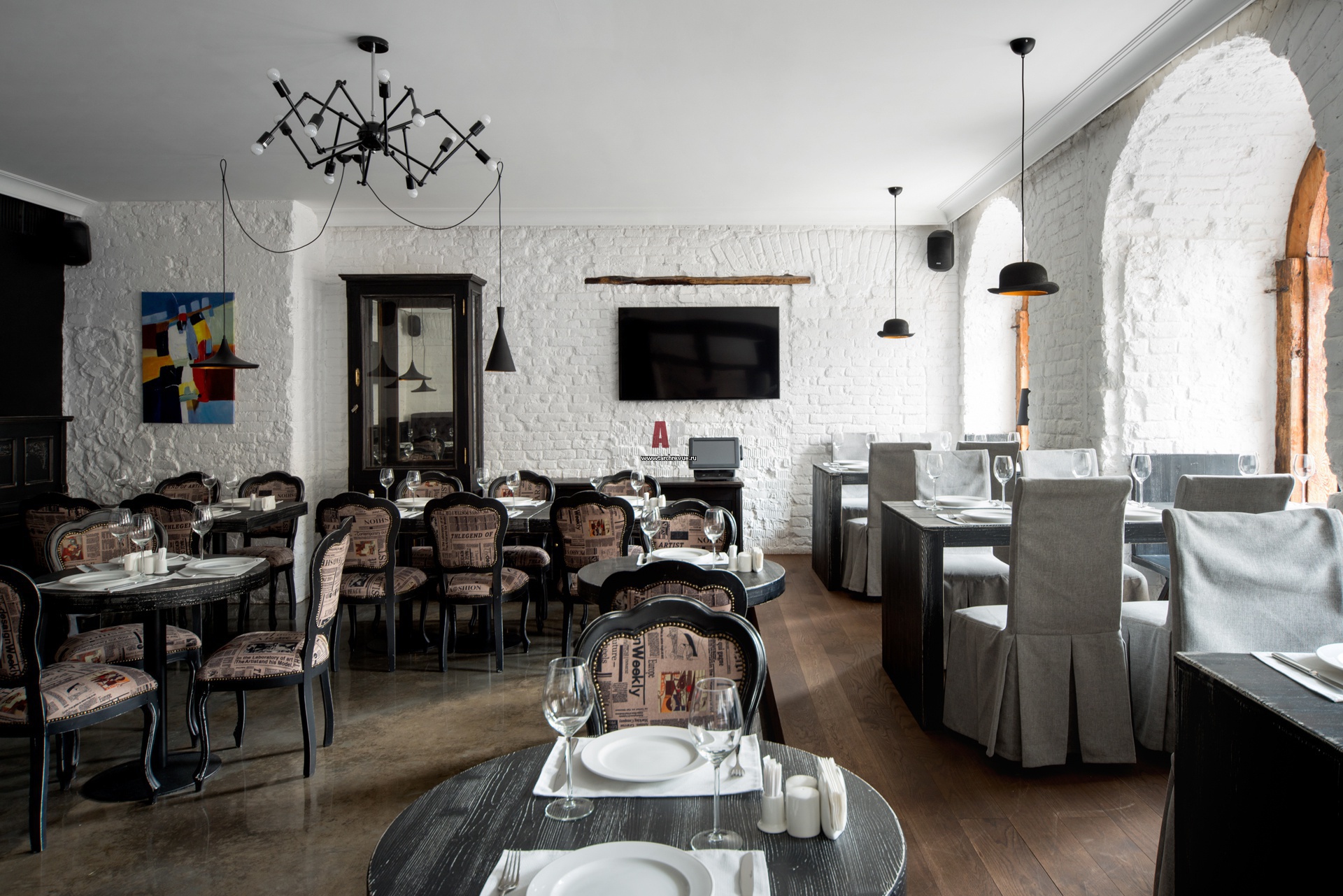 Интерьер зала ресторана. Историческая кирпичная кладка стен с арочными окнами и нишами выкрашена в белый цвет. Лепной карниз, поставщик NMC.