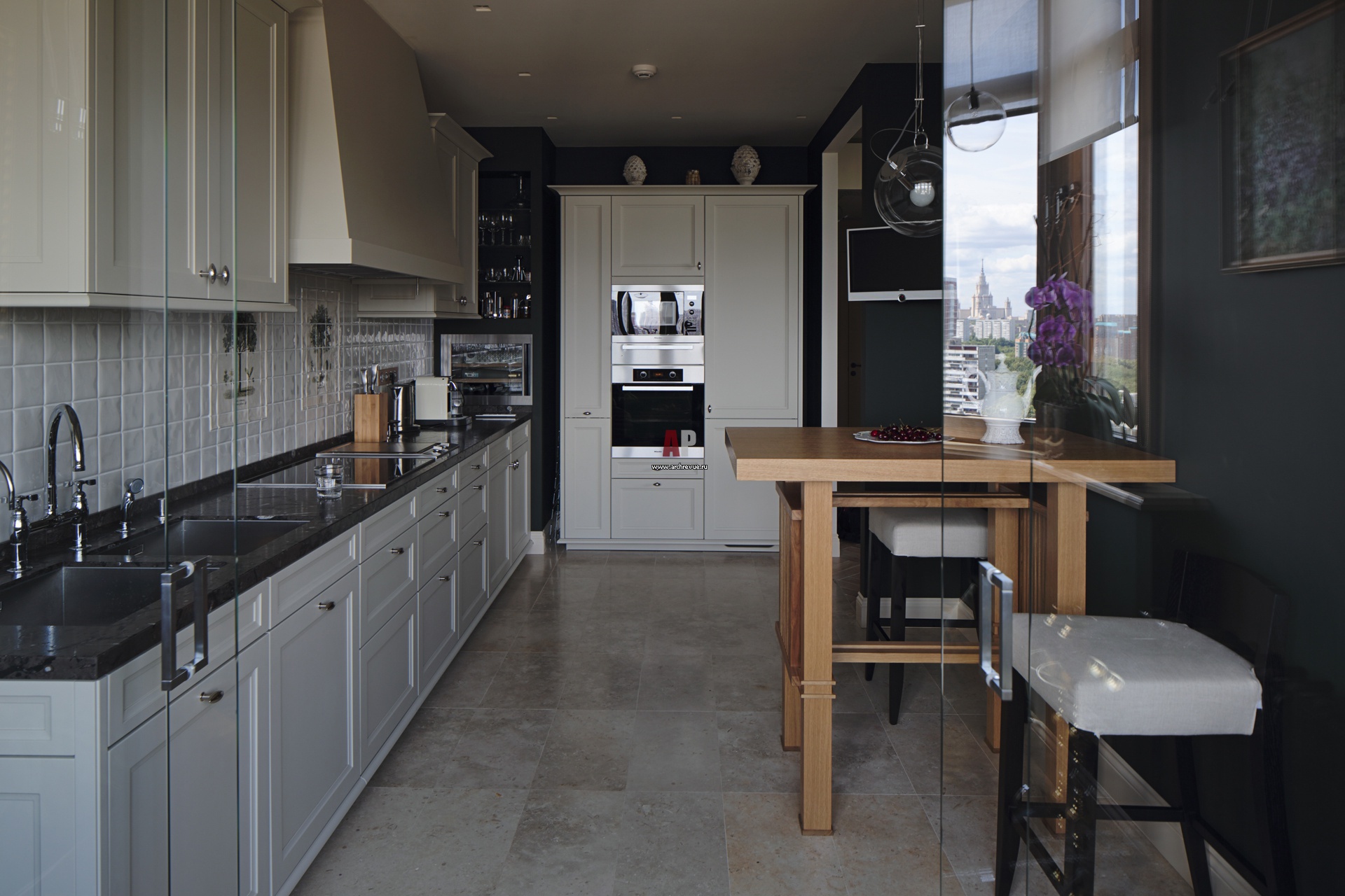 Стены кухни выкрашены в сложный оттенок зеленого. Плотный, темный цвет под разным углом зрения и при разном освещении становится то графитовым, то темно-зеленым, то сизым. На полу – большие (160Х160см) плиты из натурального мрамора. Кухонный фартук облицован белым камнем с вкраплениями морских ракушек.