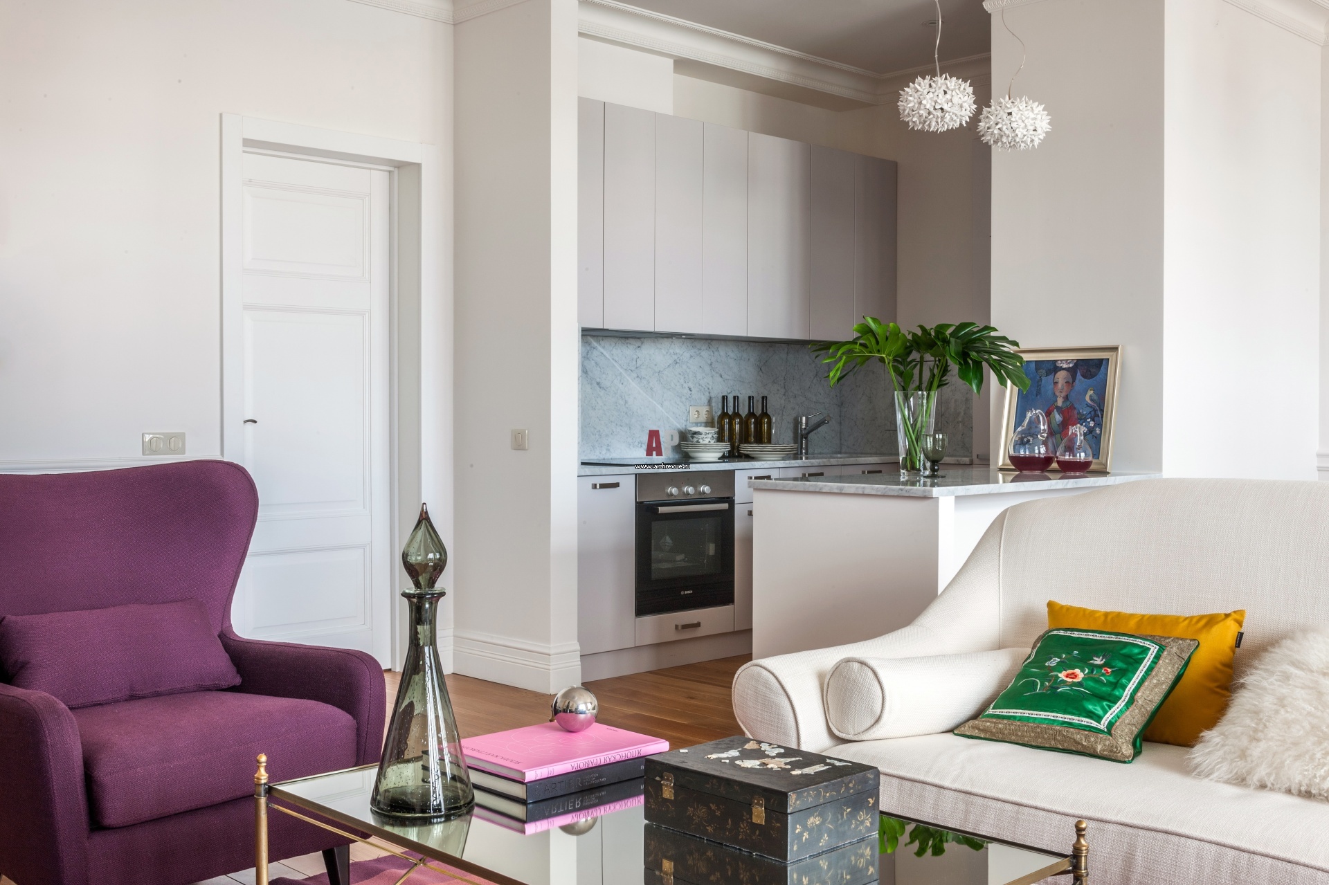 Компактная кухня включена в общий объем гостиной. От столовой она отделена несущей колонной, которая получила продолжение в виде невысокой барной стойки. Кухонный гарнитур с закрытыми фасадами жемчужного цвета сделан на заказ.