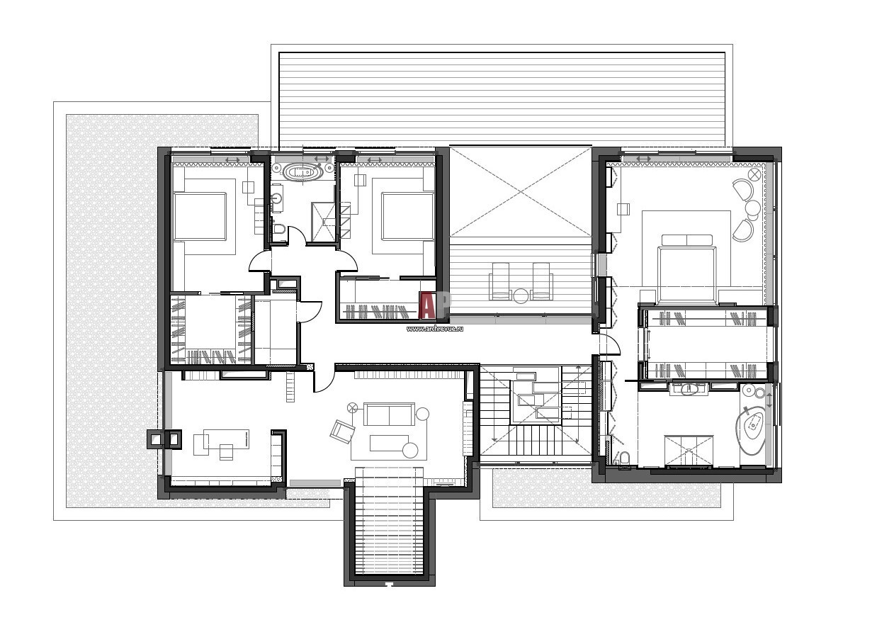 План второго этажа двухэтажного дома в Подмосковье. Общая площадь – 680 кв. м. Планировка 2 этажа 2-х этажного дома с современной архитектурой. Поселок, «Резиденция 18».