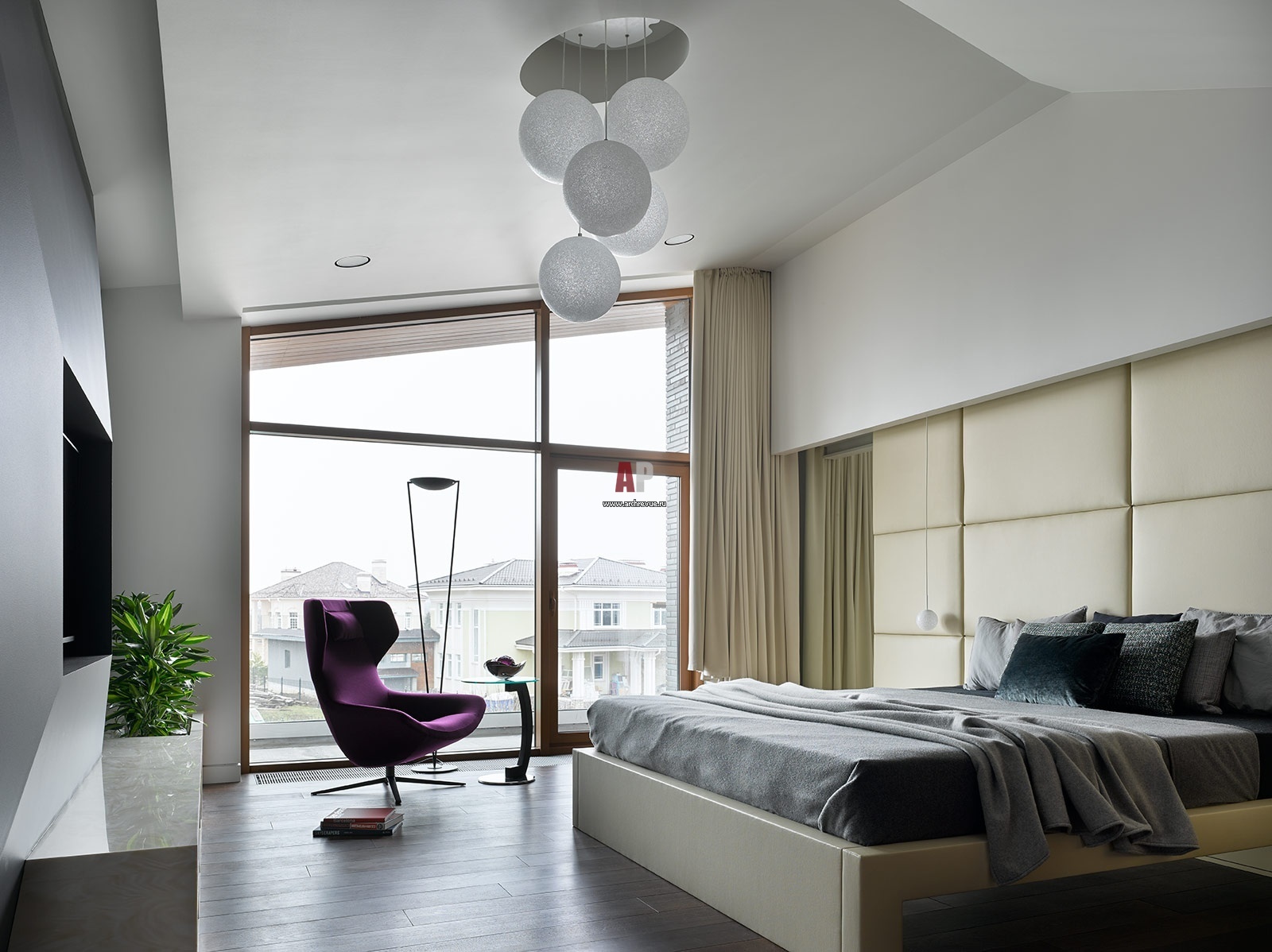Модернистский многоуровневый дом в Подмосковье. Хозяйская спальня с панорамным окном расположена на втором этаже. Стена за изголовьем кровати обита мягкими панелями.